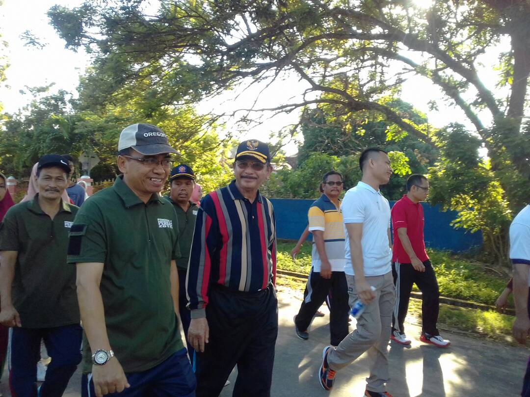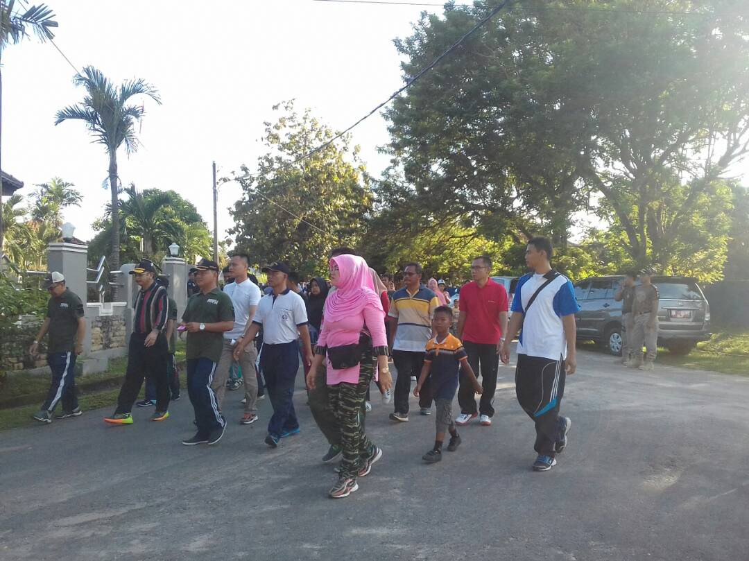 MUNTOK. Satuan Polisi Pamong Praja melaksanakan kegiatan jalan santai. Acara di laksanakan dalam rangka memeriahkan HUT Sat Pol PP ke 67 Linmas ke 55 dan Damkar ke 98. Kegiatan jalan santai di lepas oleh Bupati Bangka Barat H.Parhan Ali di mulai jam 06.00 pagi di lapangan Gelora Muntok Minggu (24-4-2017).
