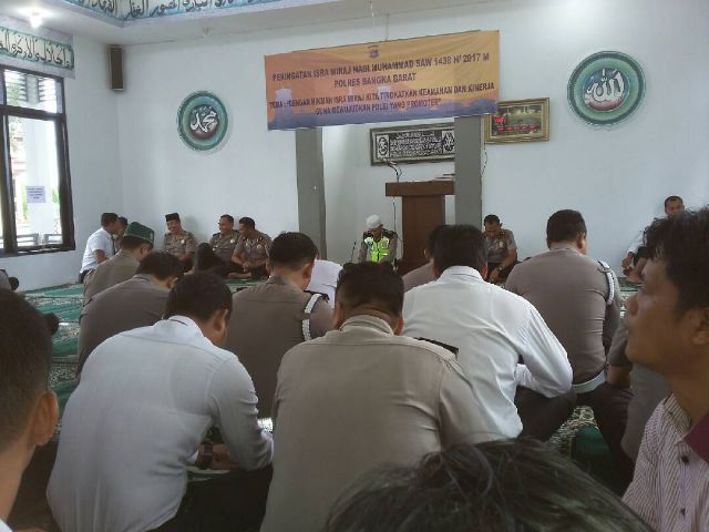 Humas Polres Babar—-Polres Bangka Barat ikut merayakan peringatan Isra Miraj di masjid arohman Polres Bangka Barat,Rabu (26/4/2017).