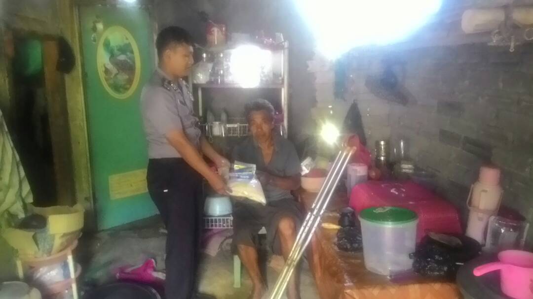 Bhabinkamtibmas Polsek Jebus yakni Briptu Amin Yulianto yang bertugas di Ds.Semulut memberikan bantuan kepada warga kurang mampu di desa binaannya.