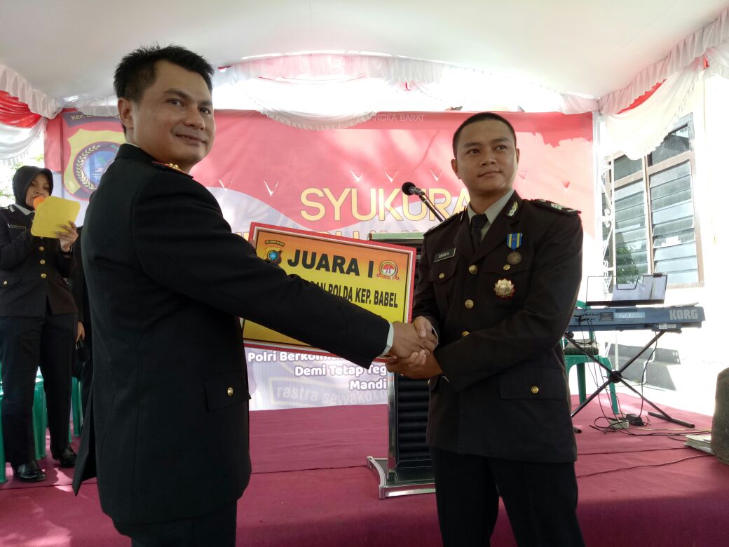 MUNTOK. Anggota kepolisian polsek kelapa Brigadir Guntur Hidaya bertugas sebagai Bhabinkamtibmas kelurahan kelapa diberikan penghargaan sebagai polisi teladan peringkat 1 Bangka Belitung dari Kepolisian Negara Republik Indonesia. Penghargaan tersebut diserahkan langsung oleh Bupati Bangka Barat H.Parhan dalam Upacara HUT Bhayangkara ke 71 dilapangan gelora Senin (10-7-2017).