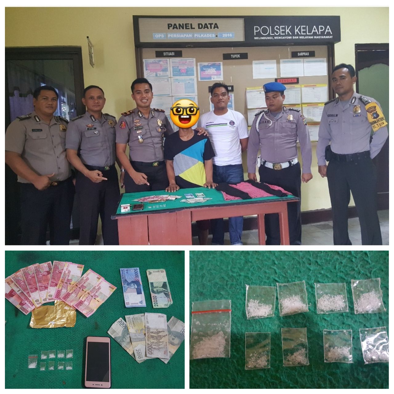 Tidak lama, pelaku diamankan oleh Unit reskrim Polsek Kelapa yang dipimpin oleh Kapolsek Kelapa di dalam bus ketika Kapolsek dan Anggota melakukan penyamaransebagaibpenumpang bus. Ketika ciri-ciri yang diinformasikan masyarakat sesuai dan Bus berhenti di depan Polsek Kelapa, pelaku Jujuk langsung disergap oleh petugas dilanjutkan dengan penggeledahan badan. Dari pelaku didapatkan BB yang diduga Narkotika Jenis Sabu yang diselipkan di dalam kertas timah rokok dan dilipat di kerah tangan kanan pelaku.