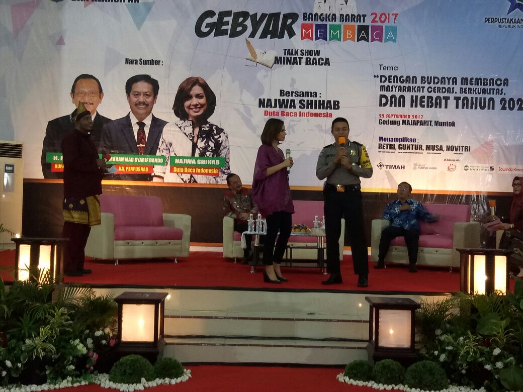 MUNTOK. Presenter TV sekaligus Duta Baca Nasional, Najwaa Shihab. Najwa mempunyai catatan saat menjadi narasumber dalam Talkshow Minat Baca yang diselenggarakan Dinas Perpustakaan dan Kearsipan Bangka Barat di gedung Majapahit Unmet Muntok, Jum’at (22-9-2017)