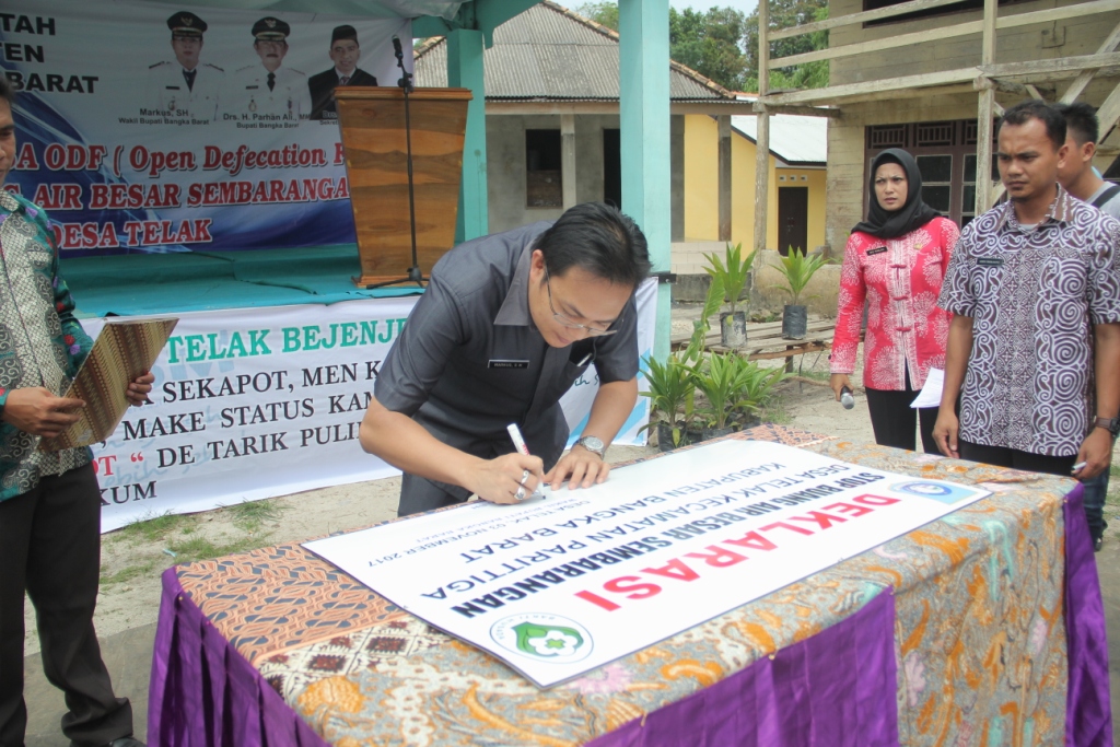 Itulah bunyi deklarasi yang dibacakan Kepala desa Telak dan diikuti perwakilan warga desa telak pada saat kegiatan Deklarasi “Open Defecation Free” ODF di desa Telak kecamatan parittiga yang disaksikan oleh Wakil Bupati Bangka Barat, Kabid Kesehatan Masyarakat Dinas Kesehatan Provinsi Bangka Belitung, Plt. Kepala Dinas Kesehatan Bangka Barat, Kepala OPD di lingkungan Pemerintah Bangka Barat, kepala seksi umum (kasium) polsek parittiga, camat parittiga dan tokoh agama dan masyarakat.