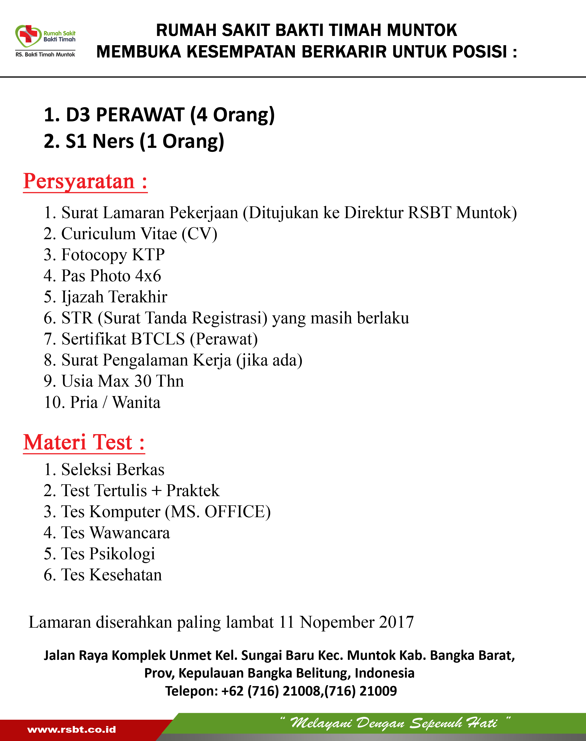 Rumah Sakit Bakti Timah Muntok Buka Lowongan untuk D3 Perawat dan S1 Ners 06/11/201706/11/2017by admin-7381 Viewsby admin Post Views: 7,381 Baca Juga : Sekretaris Tim Gugus Covid-19 Bangka Barat Positif Covid-19 Baca JugaWabup H. Yus Derahman Kunjungi Rumah Singgah Pasien Babar di PalembangPERSIT KCK Cabang LV DIM 0431 Gelar Donor DarahCegah DBD di Wilayah Operasional Perusahaan, PT TIMAH Tbk Lakukan Fogging Hingga Sosialisasikan 3MBerobat Jadi Lebih Dekat, Ratusan Warga Mentok Datangi Mobil Sehat PT TIMAH Tbk