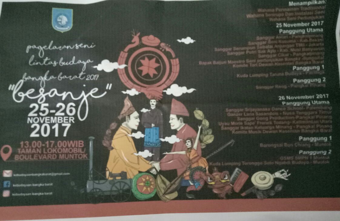 Muntok. Dinas Pariwisata dan Kebudayaan Bangka akan Barat menyelenggarakan Pergelaran Seni “Bersanje” bertempat di halaman Lokomotif, depan Rumah dinas bupati Bangka Barat pada tanggal 25 s/d 26 Nopember 2017.