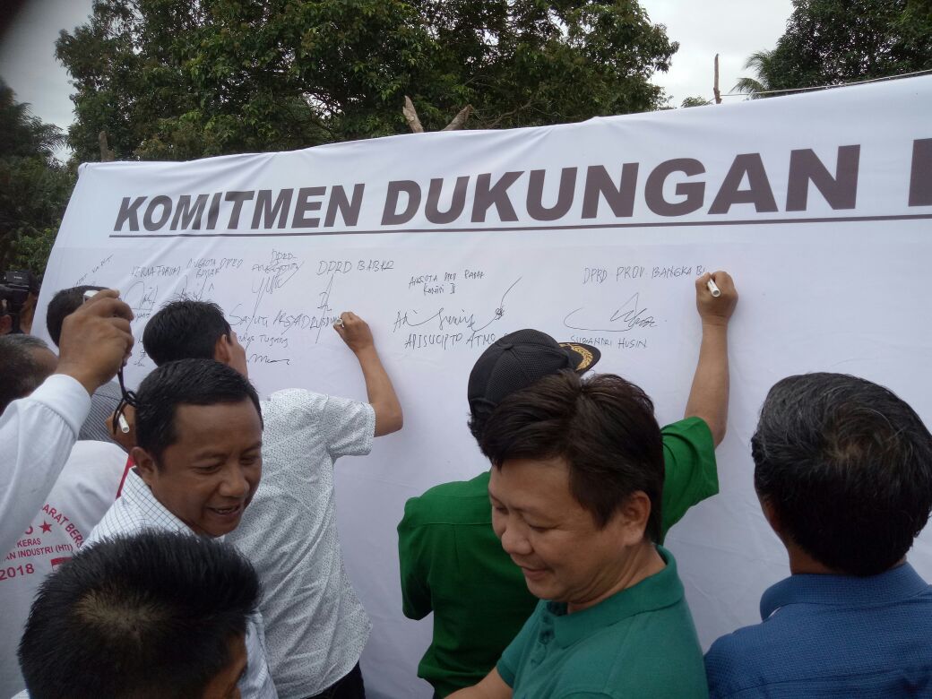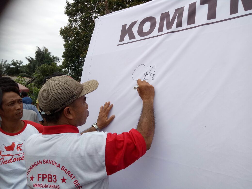 Muntok. Ribuan warga Bangka Barat berkumpul di lapangan Air Belo dalam rangka mendukung penolakan hutan tanaman industri (HTI) di Bangka Barat. Masa datang dari 6 kecamatan di Bangka Barat menyatukan tekad di tandai dengan deklarasi Forum Perjuangan Bangka Barat Bersatu (FPBBB) dan penandatanganan penolakan terhadap HTI disertai simulasi masyarakat tentang penolakan HTI. Aksi dihadiri oleh Pengurus FPBBB, anggota DPRD propinsi Babel Subandri, Anggota DPRD,Bangka Barat Yuhanis, Adi Cipto Atmo, Rusdian, Sayuti, Herwanto,Camat, Kades, serta Masyarakat Bangka Barat pada hari Sabtu (6-1-2018)