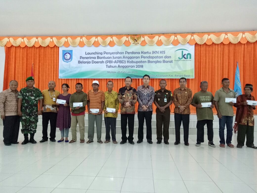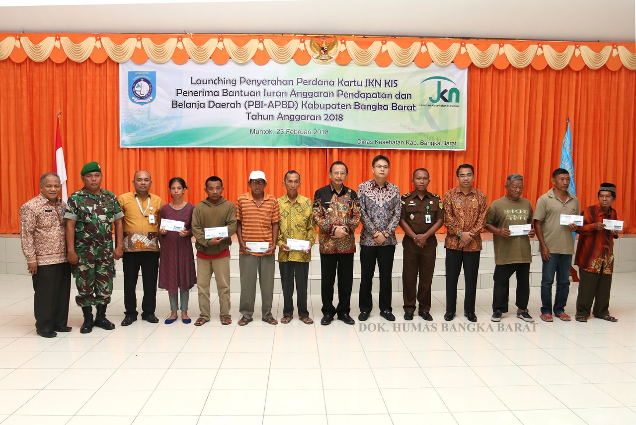 MUNTOK – Pemerintah Kabupaten Bangka Barat melauncing kartu Jaminan Kesehatan Nasional (JKN) – Kartu Indonesia Sehat (KIS) penerima bantuan iuran anggaran pendapatan dan belanja daerah (PBI-APBD). Pemberian kartu secara simbolis dilakukan oleh Bupati H.Parhan Ali, Wakil Bupati, Markus serta Sekretaris Daerah, H. Yunan Helmi kepada wakil masyarakat penerima kartu JKN-KIS di Graha aparatur pemkab Bangka Barat, Jumat (23/2).