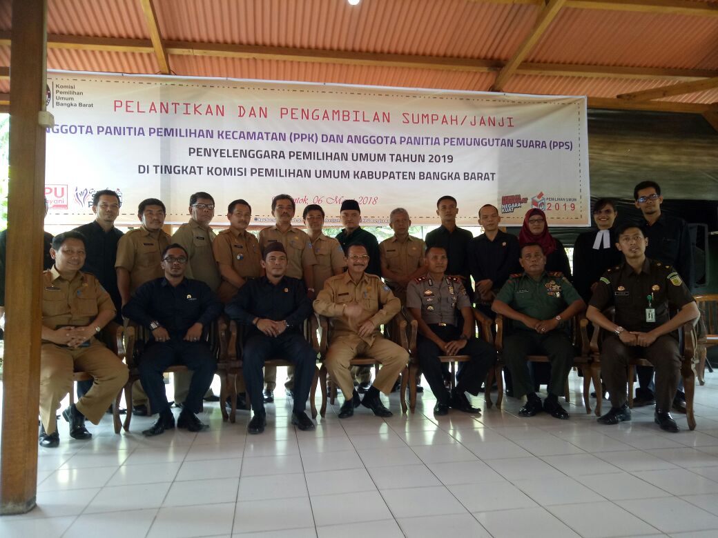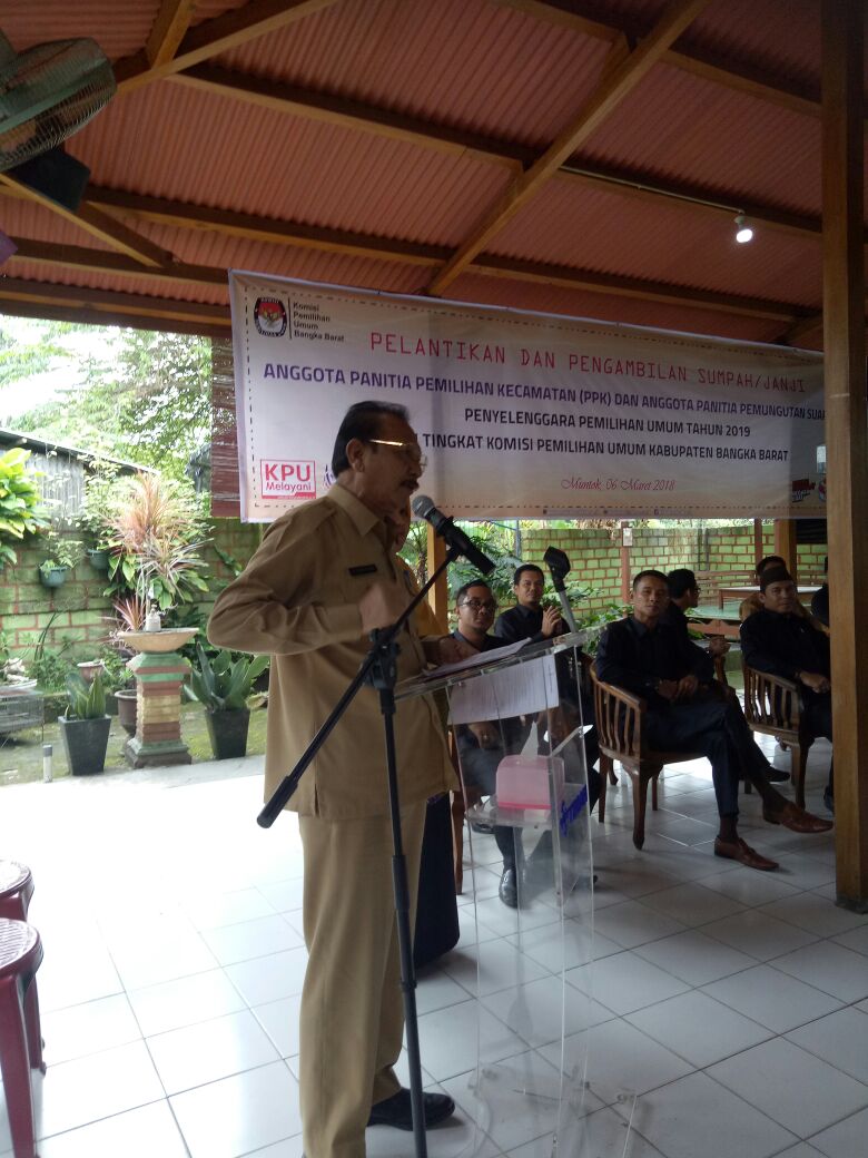 MUNTOK – Menghadapi pemilihan umum tahun 2019, Komisi Pemilihan Umum Kabupaten Bangka Barat melantik anggota Panitia Pemungutan Suara (PPS) dan Panitia Pemilihan Kecamatan (PPK) pada Selasa (6/3) di Rumah Kebun, Muntok.