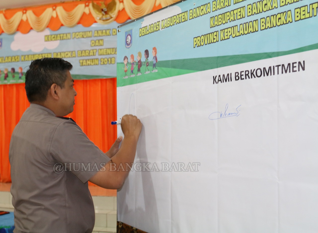Muntok, Kabupaten Bangka Barat menuju kabupaten layak anak. Deklarasi ditandai dengan komitmen bersama oleh seluruh stekholder melalui sebuah penandatangan Deklarasi bersama dipimpin oleh Bupati H Parhan Ali,diikuti oleh selurih tamu undangan. Senin (26-3-2018).