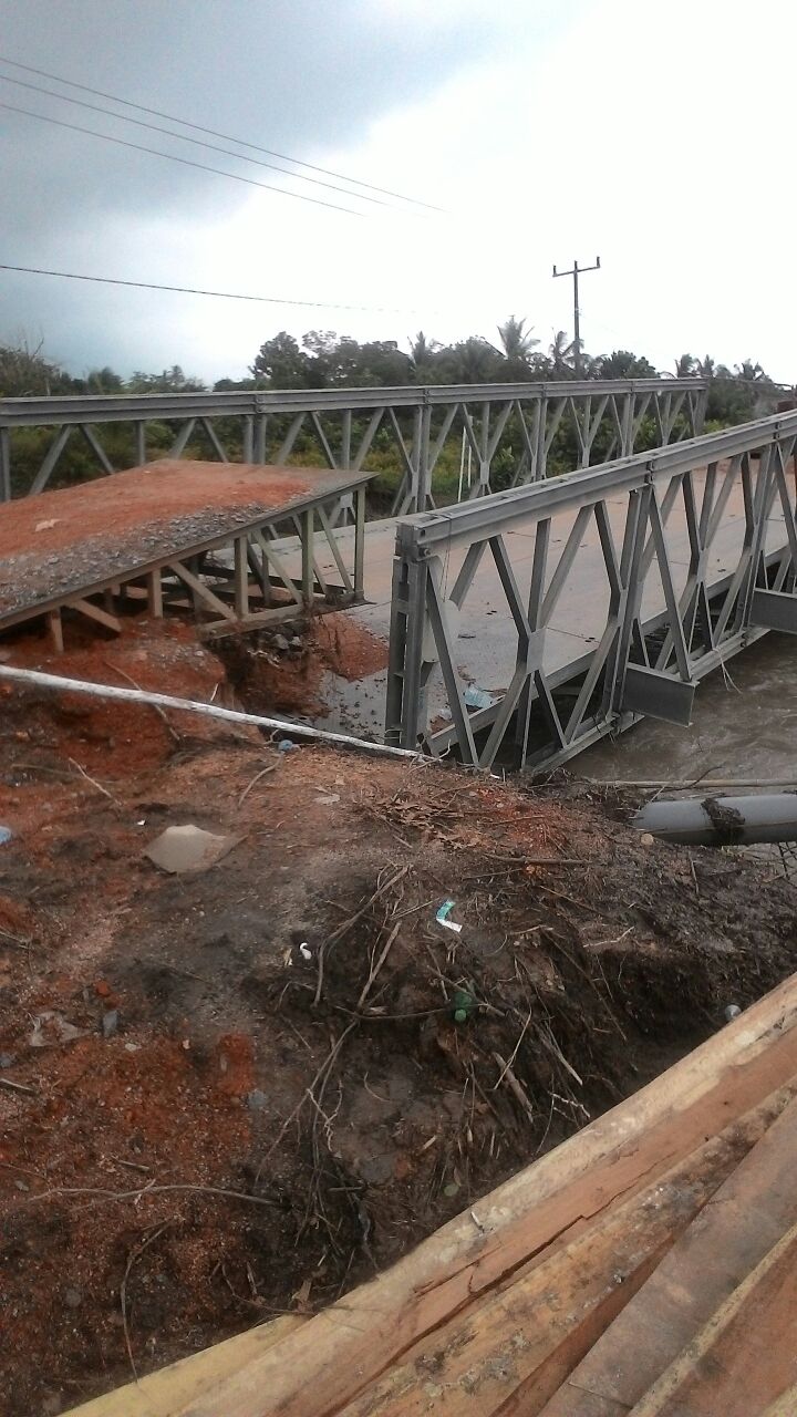 Muntok. Hujan deras beberapa hari lalu, membuat kondisi jembatan baelley di desa Belo Laut semakin memprihatinkan. Kondisi jembatan yang miring akibat tergerus air dengan pondasi bergeser dan telah turun, membuat jembatan dikhawatirkan roboh. Kondisi jembatan hanya bisa dilalui kendaraan roda dua, itupun harus antri satu persatu. Hal ini disampaikan oleh Suhaidir alias Kojek tokoh pemuda Belo Laut melalui telepon seluler kepada Radio Pilar Senin (2-4-2018)