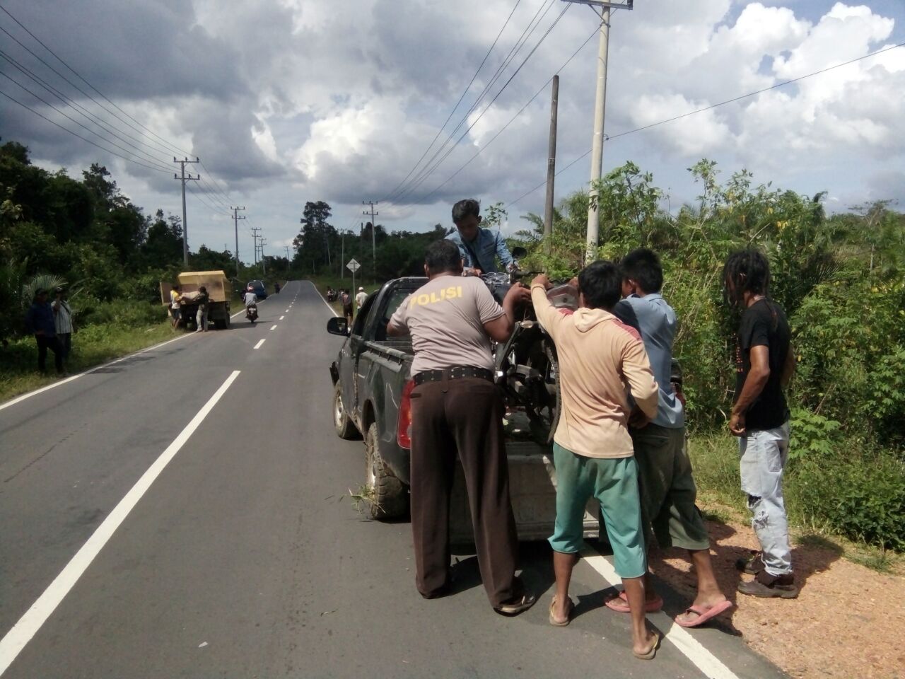 Mobil Hiluk yang melaju dari arah pangkalpinang hendak menuju muntok kemudian tanpa sebab mobil tersebut oleng dan meyenggol sepeda Motor yamaha scorpio nopol Bn 2661 QS Yang melaju dari arah mentok