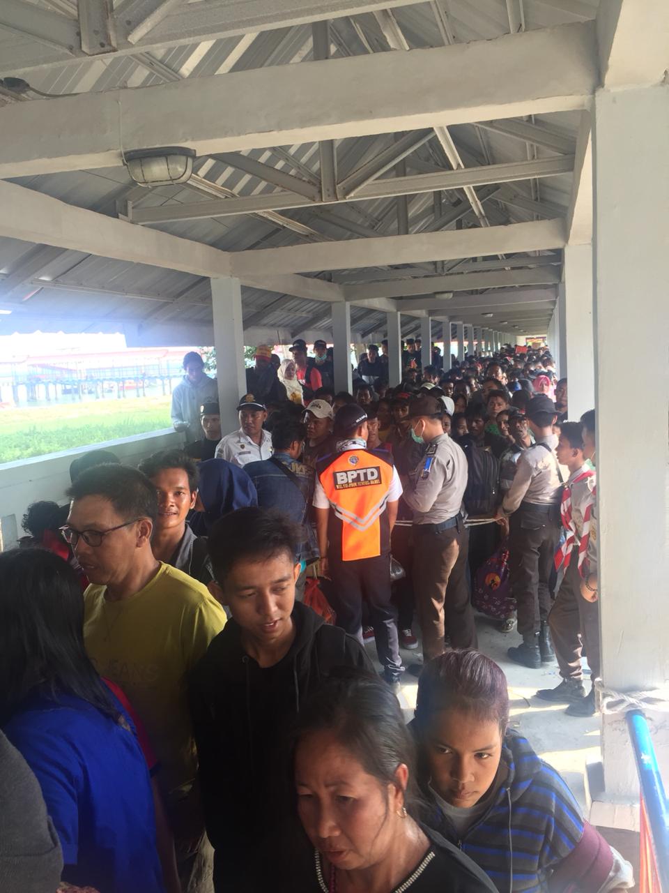 “Ada sekirar 8.000 orang yang akan menyeberang hari ini, mereka memakai kendaraan roda empat 704 kendaraan, dan roda dua 556 kendaraan, menyebabkan antrian panjang menunggu kapal yang akan menyeberangkan mereka ke pelabuhan Tanjung Siapi-api,”jelas Wahyudi