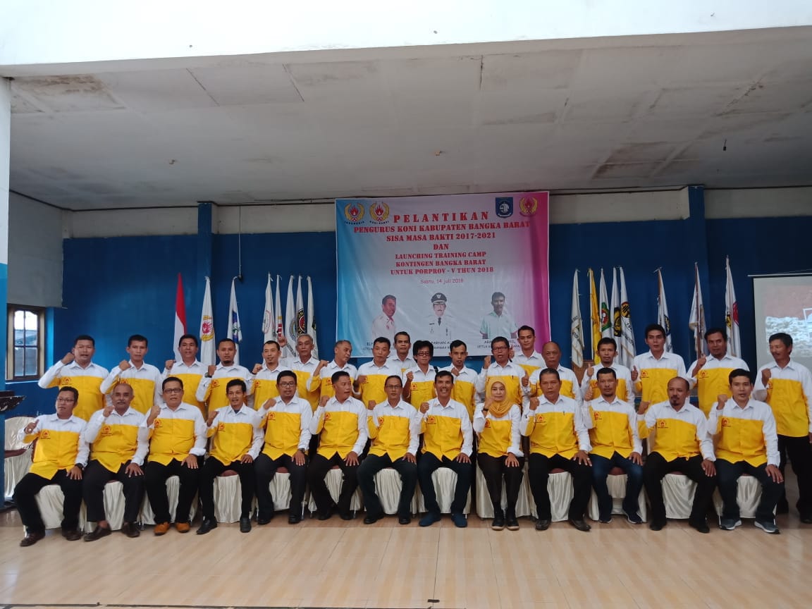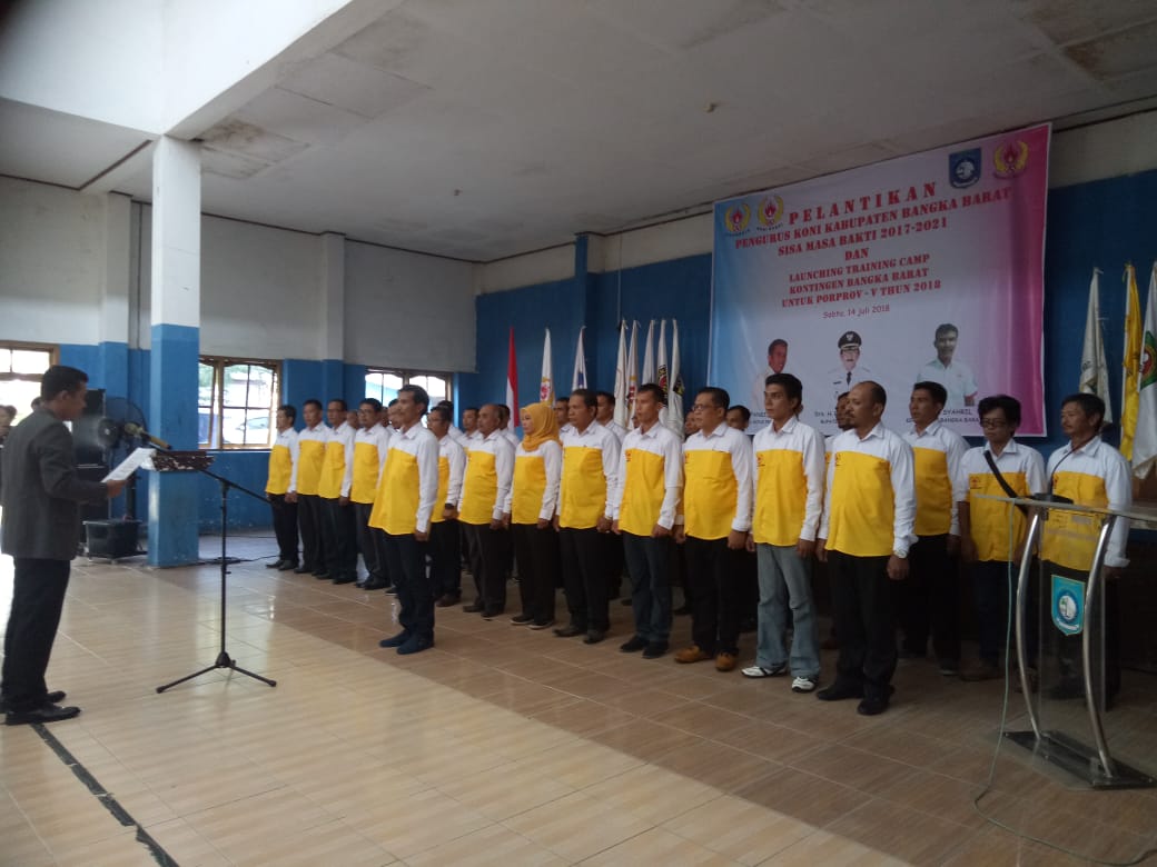 MUNTOK – Ketua Umum Koni Provinsi Kepulauan Bangka Belitung (Babel) Elfandi melantik Ketua Koni Kabupaten Bangka Barat (Babar) Arman Syahril beserta 34 pengurus lainnya. Pelantikan Sabtu (14/7) di GOR Muntok.