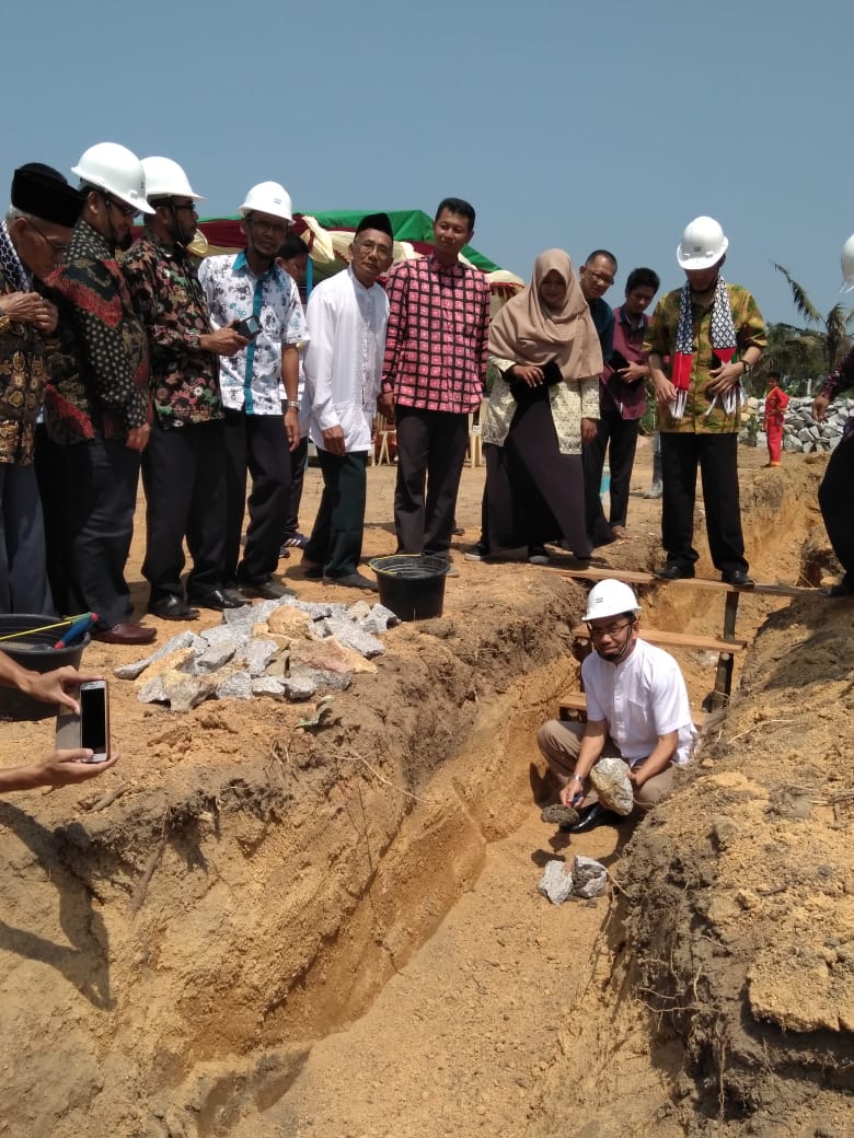 Muntok, Sekretaris Daerah Kabupaten Bangka Barat, Drs. H. Yunan Helmi, M.Si menghadiri peletakan batu pertama pembangunan Unit Sekolah Baru (USB) SMP Muhammadiyah Muntok Program Premium, di kampus SMP Muhammadiyah Muntok, Sabtu (14-7-2018)