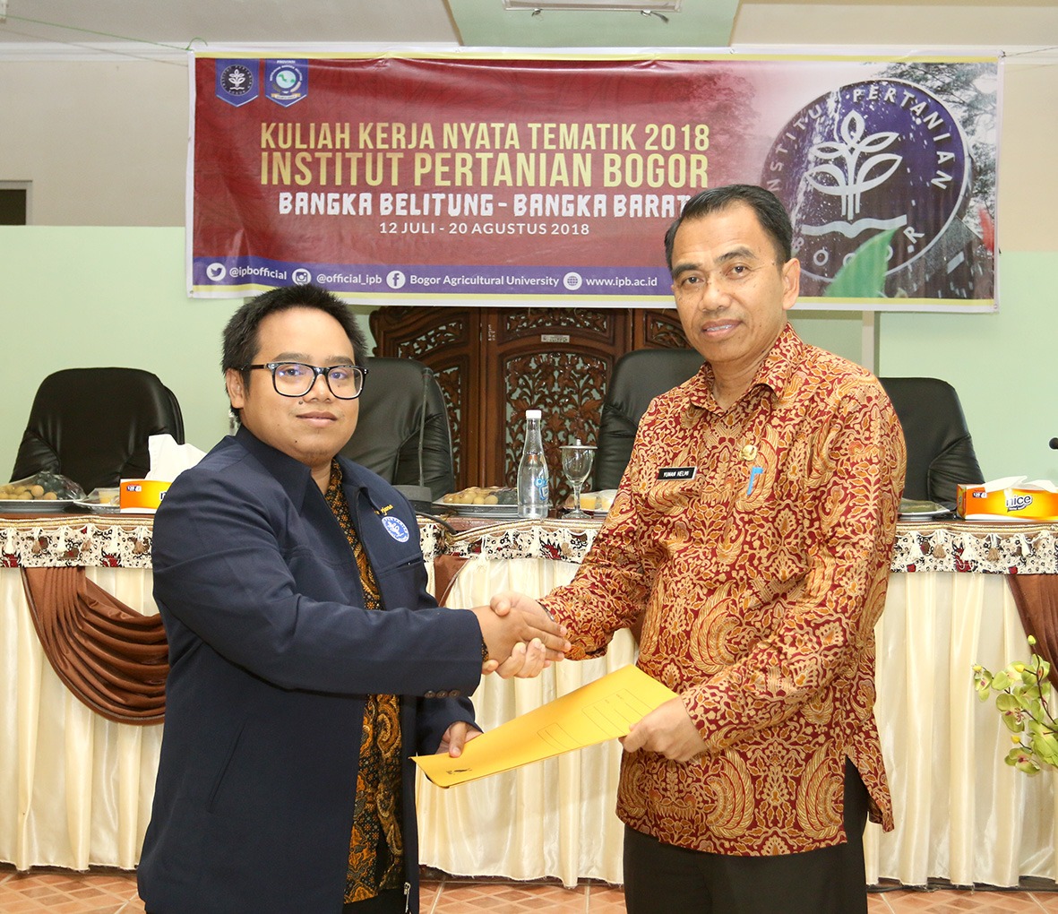 Dalam acara serah terima Mahasiswa KKN IPB kepada Pemerintah Kabupaten Bangka Barat yang dilaksanakan di OR II, Setda Bangka Barat, mahasiswa yang didampingi oleh dosen pendampingnya, Katana Sapanli, diterima oleh Sekretaris Daerah, H. Yunan Helmi beserta Asisten Perekonomian dan Pembangunan, H. Rozali, Asisten Administrasi dan umum, Herzon, beserta beberapa Kepala OPD, Camat, lurah/kepala desa serta undangan lainnya.
