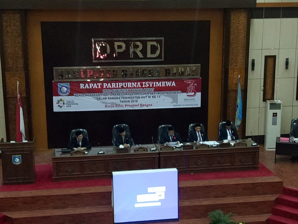 MUNTOK. Dewan perwakilan Rakyat Daerah (DPRD) Bangka Barat menggelar paripurna istimewa mendenggarkan pidato kenegaraan presiden dalam rangka HUT RI ke 73. Rapat digelar di gedung MahligaiBetason 2 DPRD Bangka Barat, dipimpin Ketua DPRD Hendra Kurniadi, dihadiri oleh Bupati, Wakil Bupati, Wakil Ketua I dan II beserta anggota DPRD Bangka Barat, Kajari, Wakapolres, serta tamu undangan. (Kamis, 16 -8-2018)