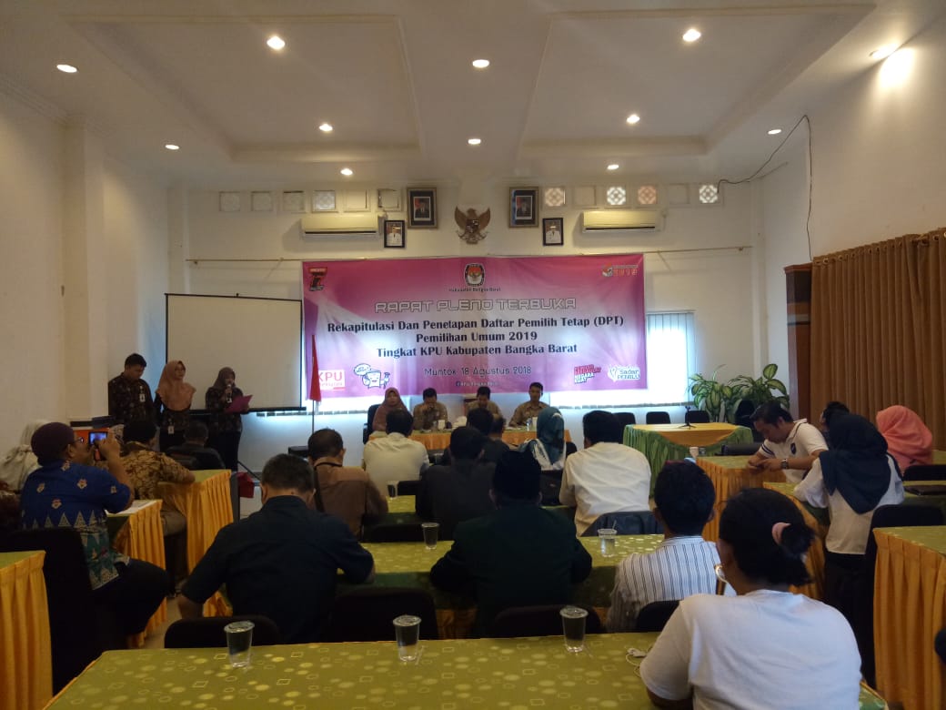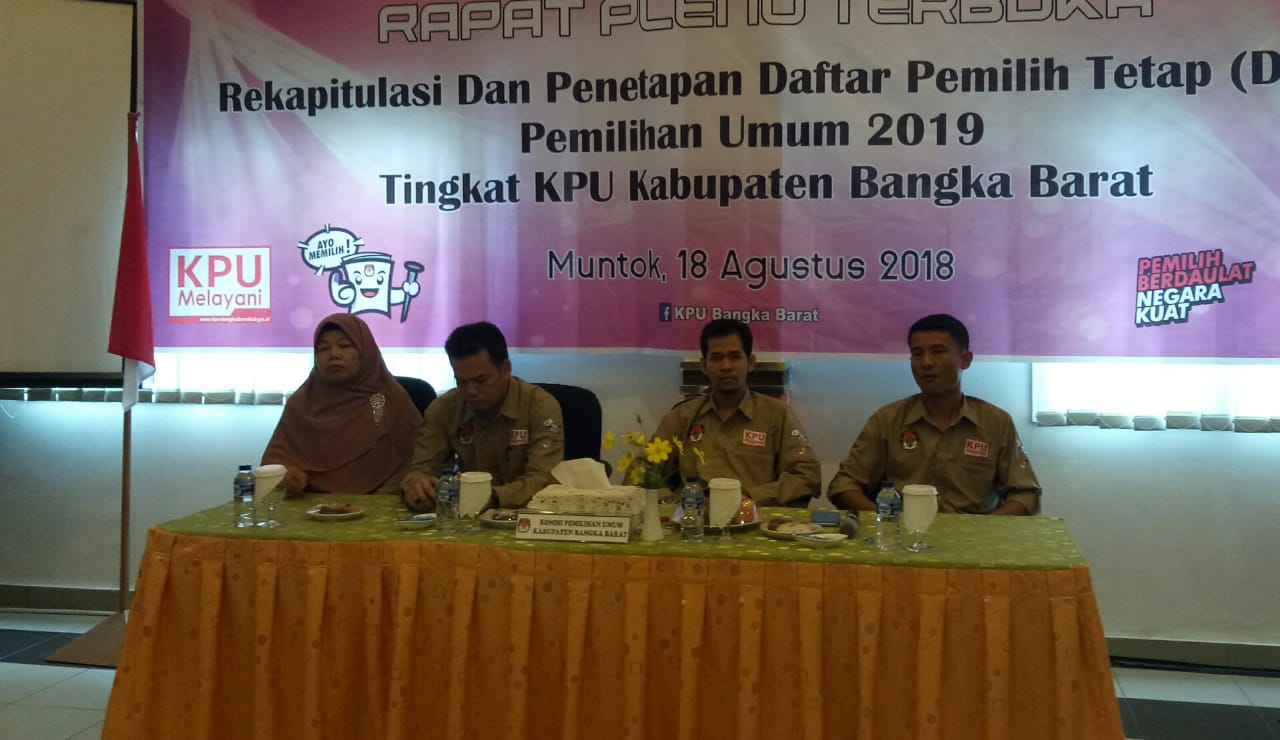 Muntok. Komisi Pemilihan Umum Daerah (KPUD) Bangka Barat menetapkan jumlah pemilih tetap dalam pemilu 2019 sebanyak 126.292 pemilih. Demilian disampaikan Ketua KPUD Bangka Barat Pardi dalam Rapat Pleno Rekapitulasi dan Penetapan Daftar Pemilih Tetap tingkat KPUD Bangka Barat, Sabtu (18-8-2018)