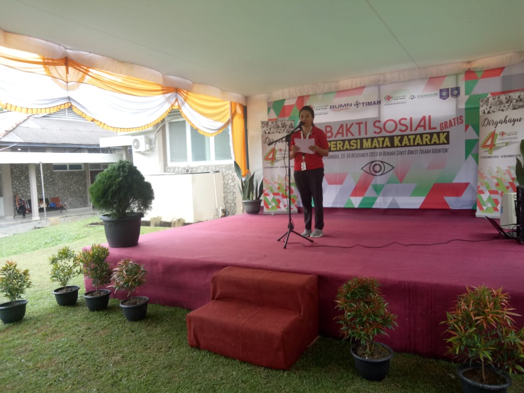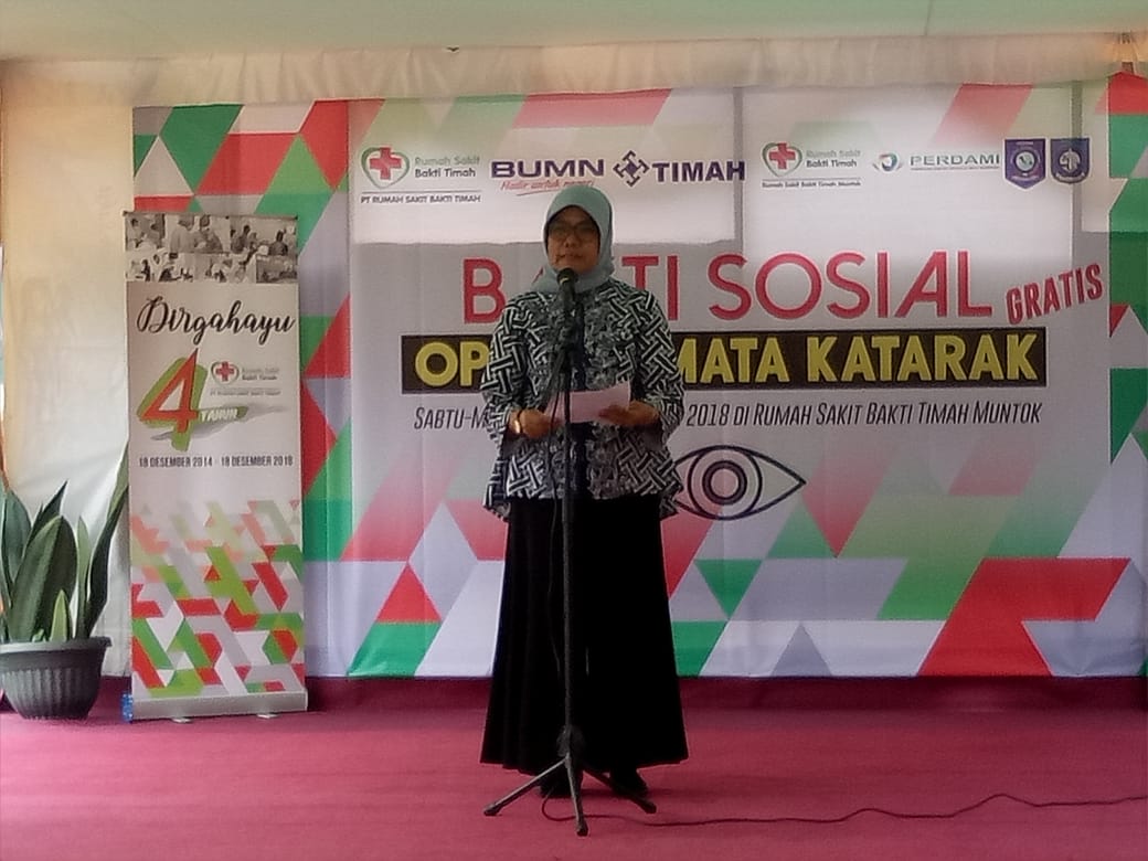 “Saya ucapkan terimakasih atas terselenggaranya kegiatan ini, kepada seluruh Dokter, Dokter Yovita serta panitia dan kepada Bapak, ibu peserta yang telah yang telah datang untuk dapat merasakan penglihatannya dapat kembali. Kita bersyukur dalam peringatan hari ulang tahun RSBT ke 4, kami dibantu sepenuhnya dari PT timah, sebagai induk PT RSBTuntuk mendanai acara ini. sehingga acara ini dapat diselenggarakan di RSBT muntok. Kemudian menyusul setelah ini akan menyusul tiga acara berikutnya kegiatan selanjutnya yaitu di RSBT pangkalpinang untuk operasi bibir sumbing, kemudian di Klinik Bakti TimahTanjung Pandan untuk operasi Mata katarak dan RSBT karimun untuk kegiatan operasi katarak. Jadi kami merasa perlu untuk ikut berpartisipasi didalam PT TIMAH beserta group, untuk memberikan kontribusinya terhadap pemerintah dimana wilayah PT Timah beroperasi, dengan apa yang bisa kami lakukan khususnya dibidang kesehatan,