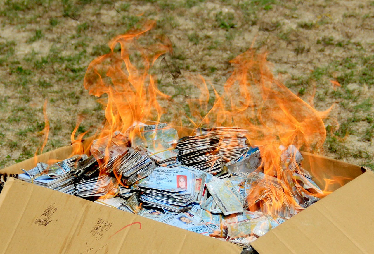 “Berdasarkan instruksi dari yang diterima pada Jum’at, 14/12/2018 dari Kementrian, Dirjen Depdagri, Dinas Dukcapil Bangka Barat harus memusnahkan E.KTP yang telah rusak dan invalid atau ada kesalahan pada data, baik itu lNama, lahir, alamat, dsbnya, dengan cara dibakar. Jumlah E-KTP yang dimusnahkan sebanyak 4.854 buah,”jelas Iduwan
