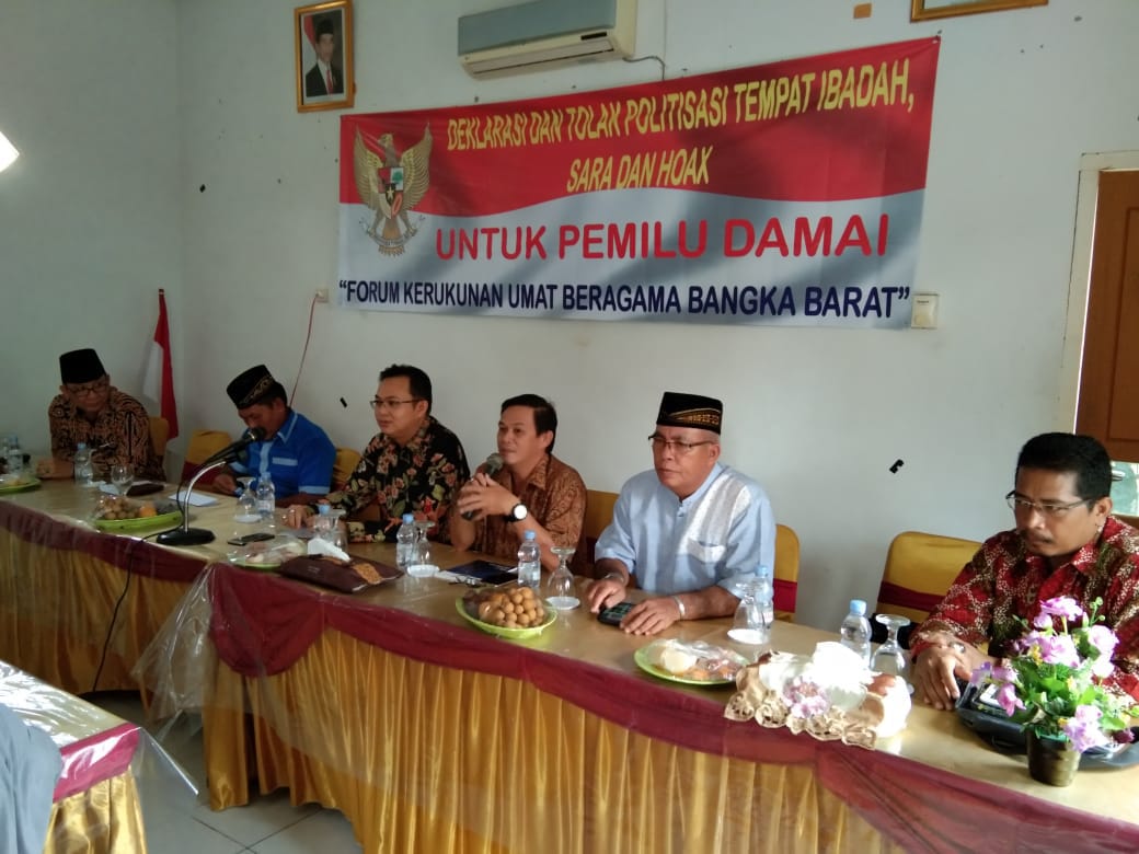 MUNTOK– Forum Kerukunan Umat Beragama (FKUB) Bangka Barat (Babar) menggelar deklarasi dan tolak politisasi tempat ibadah, sara dan hoax