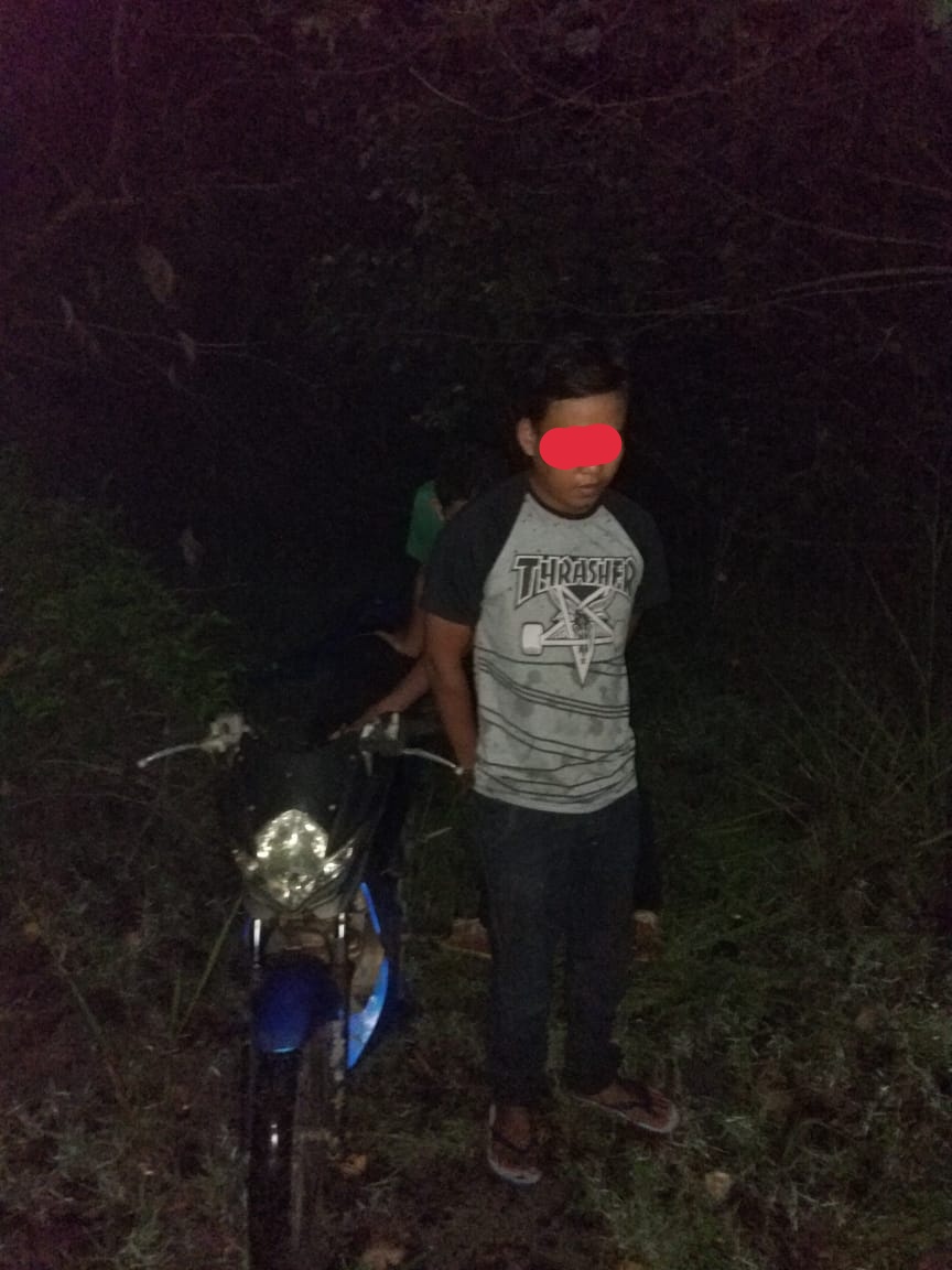 “Pelaku Curat dan curanmor diamankan petugas polsek Jebus dan Koba di hutan Koba, saat dilakukan pengembangan, diketahui pelaku telah mengambil sebuah sepeda motor suzuki satria FU warna biru hitam yang di sembuyikan pelaku di hutan Koba,”ujar Kapolsek