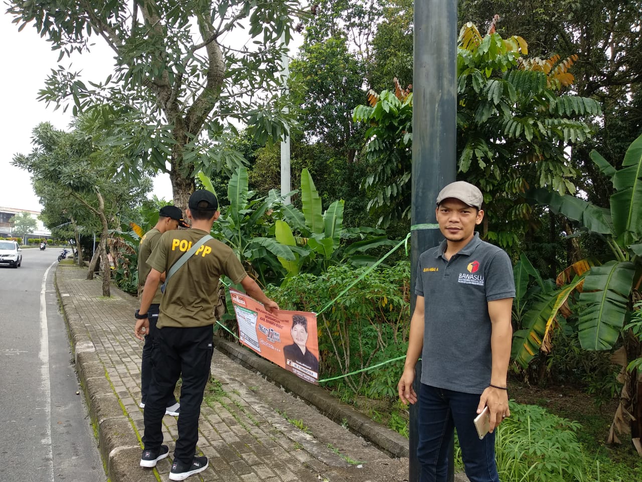 MUNTOK. Badan Pengawas Pemilu Kabupaten Bangka Barat, dibantu Satpol PP daerah setempat melakukan penertiban alat peraga kampanye yang melanggar aturan di wilayah Kecamatan Muntok.