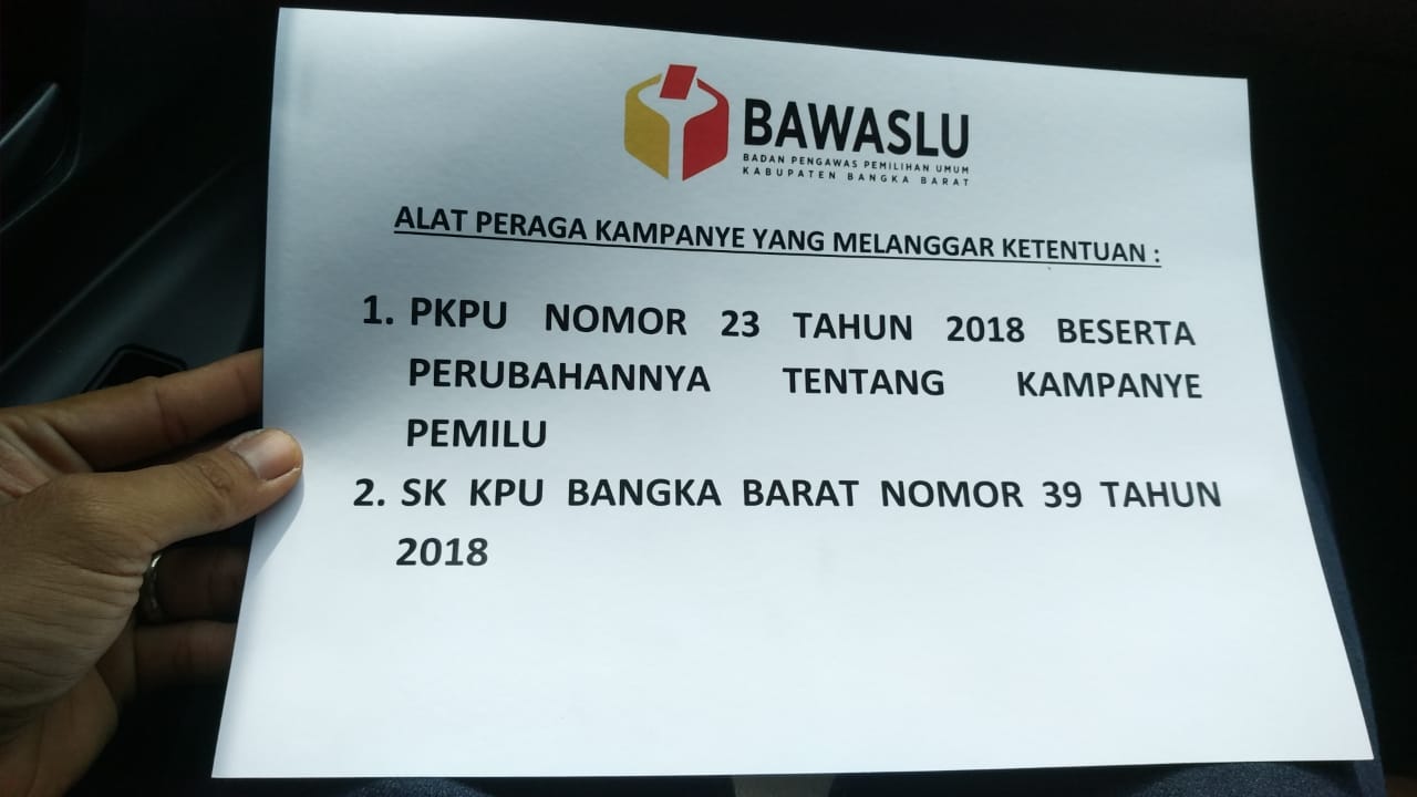 “Penertiban ini kami lakukan di lokasi yang secara aturan tidak diizinkan dipasang, seperti di pasar, jalan protokol, tempat sarana dan prasarana publik,” kata Ketua Bawaslu Kabupaten Bangka Barat Rio Febri Pahlevi, Jumat.(19/1/2019)