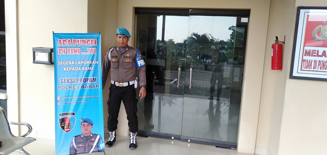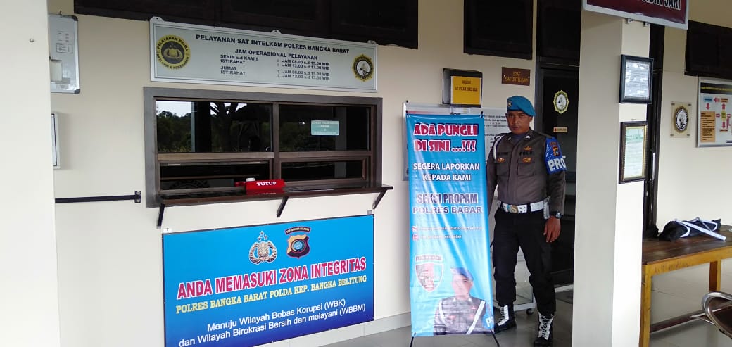 Sebagai upaya mewujudkan program prioritas Kapolri yang tertuang dalam PROMOTER sebagai fungsi pengamanan, personel Sipropam Bangka Barat memasang banner himbauan Anti Pungutan Liar (Pungli). Senin (11/03/2019).
