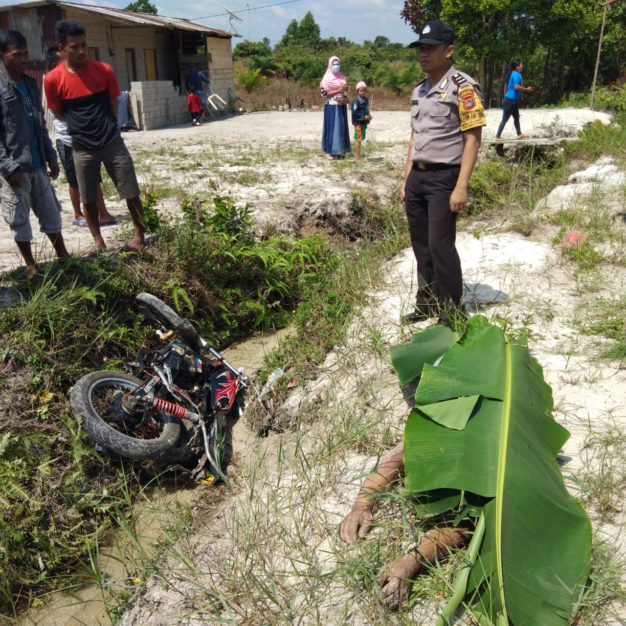 tergeletak disamping parit, tak jauh dari itu sebuah sepeda motor Yamah RX King tergetak dalam parit tersebut. Kejadian terjadi sekira Pukul 10.15 wib di dusun Jampan desa Kelabat Parittiga Jum”at (3-4-2019)