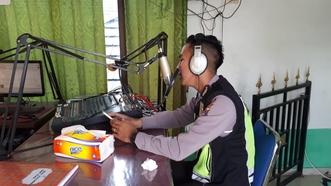 Briptu Erik Anggota Satlantas Polres Bangka Barat dalam himbauannya di radio kepada masyarakat kabupaten Bangka Barat khususnya pendengar radio Pilar mengajak mematuhi aturan berlalu lintas.