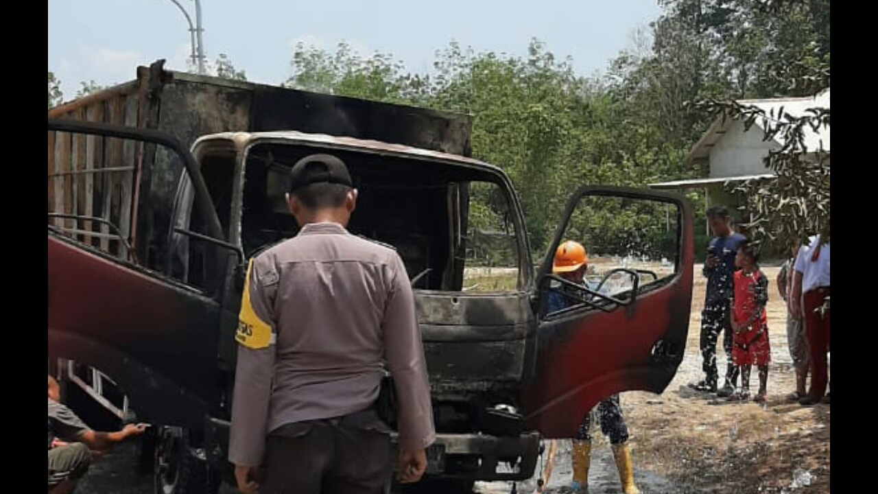 TEMPILANG .Satu Mobil Jenis Truck merk Toyota Dyna Warna merah dengan No Pol B 9615 CV, mengalami musibah terbakar. Kejadian terjadi di jalan Raya dusun Nyikep Desa Penyampak Kecamatan Tempilang. Truk diduga mengangkut Cat dalam kemasan kaleng yang mudah terbakar. Selasa (15-10-2019) siang