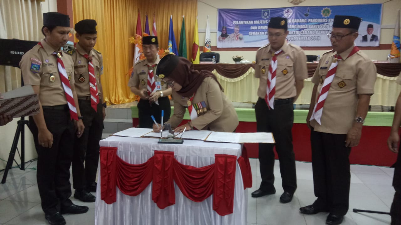 MUNTOK. Ketua Kwartir Daerah Pramuka Propinsi Bangka Belitung Melati Erzaldi SH melatik Majelis Pembimbing Cabang (MAPEMCAB) , masa bhakti 2019 -2024, Gerakan Pramuka kwartir cabang Bangka Barat, di gedung Batu Rakit Diklat pemkab Bangka Barat.Kamis (28/11/2019) sore