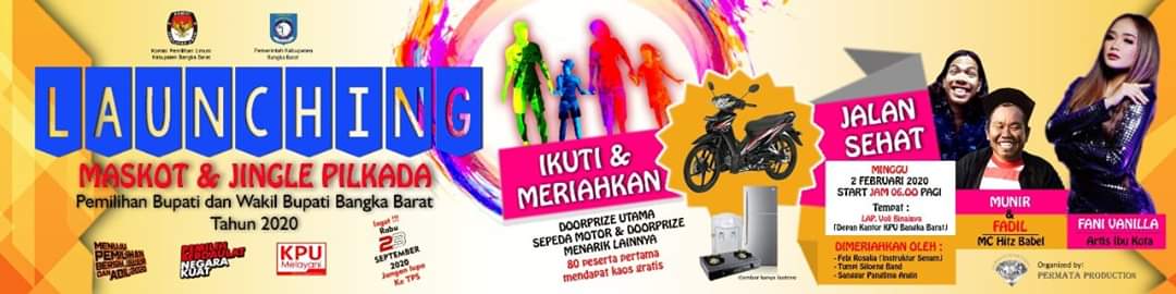 “Launching Maskot dan Jinggle KPU Bangka Barat merupakan salah satu tahapan Pilkada Bangka Barat. Acara akan dimulai pukul 6:00 pagi, dengan Jalan Sehat, lalu telah disiapkan untuk peserta yang hadir doorprize, salah satunya akan mendapatkan 1 unit sepeda motor, bagi yang beruntung, “jelas Yulizar, pada Konprensi Pers, di Cafe Orangge , Rabu, (29-1-2020)