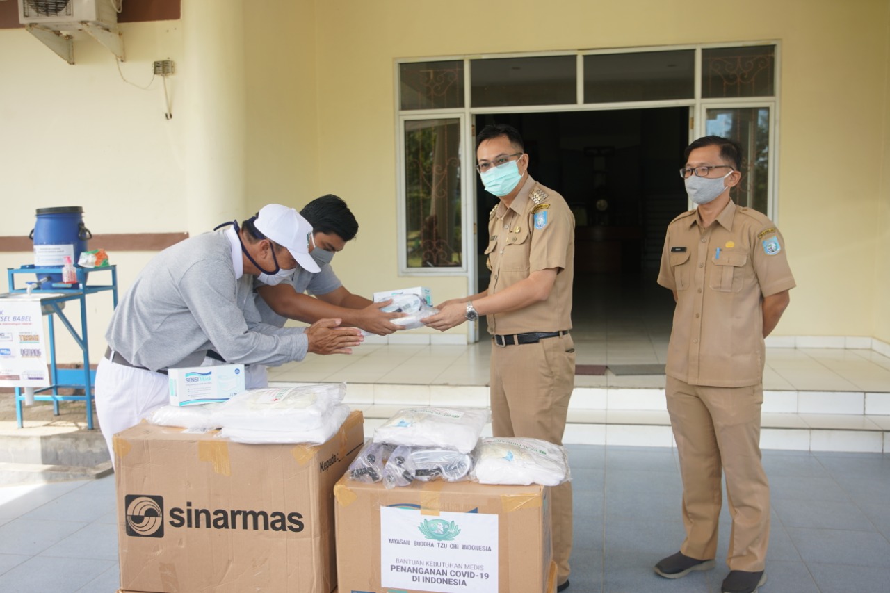 MUNTOK– PT Sinarmas Group dan Yayasan Tzu Chi Sinar Mas menyerahkan bantuan perlengkapan alat pelindung diri (APD) untuk para tenaga medis di Kabupaten Bangka Barat.