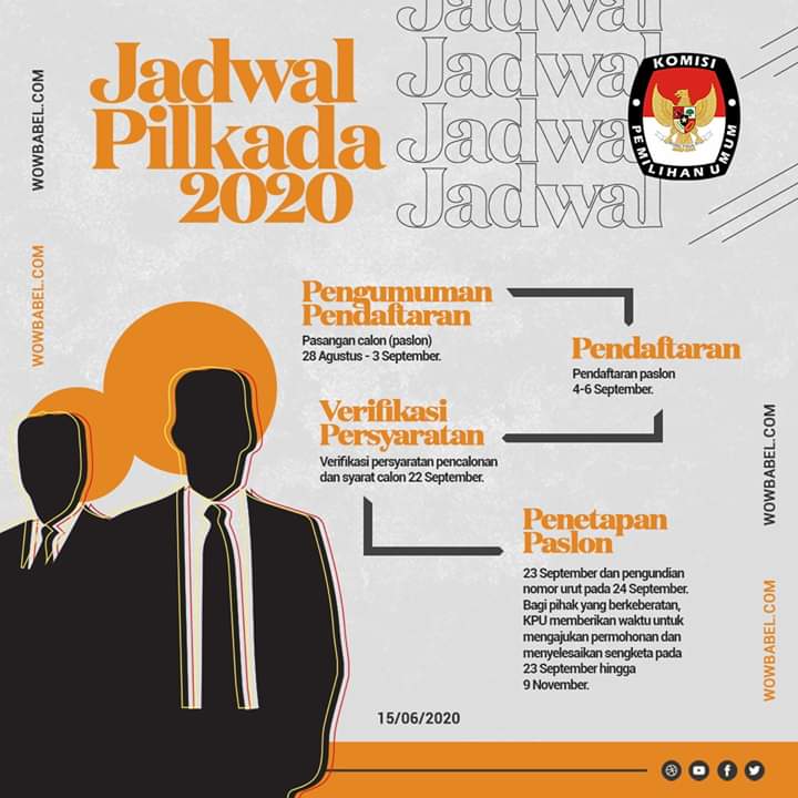 MUNTOK. Pilkada serentak akan digelar pada tanggal 9 Desember 2020. Komisi Pemilihan Umum (KPU) Bangka Barat mulai tanggal 15 Juni 2020 telah melakukan kembali tahapan Pilkada serentak. Berbeda dengan sebelumnya tahapan lanjutan dilaksanakan dalam masa pandemi covid 19, dilakukan dengan melaksanakan protokol kesehatan pencegahan penyebaran covid 19.
