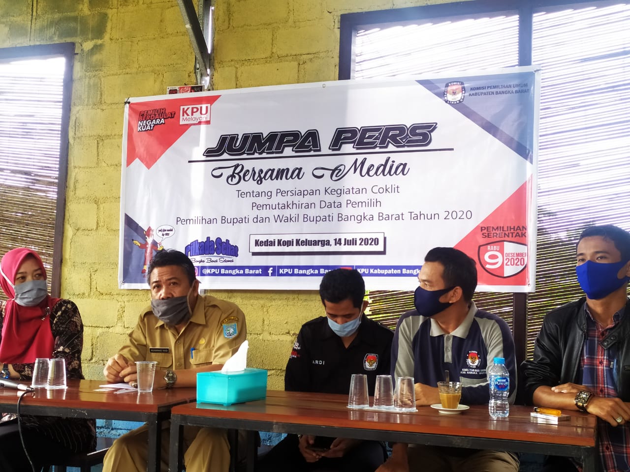 MUNTOK. Komisi Pemilihan Umum (KPU) Kabupaten Bangka Barat menggelar Konperensi Pers bersama pimpinan partai politik dan awak media tentang Persiapan Kegiatan Coklit Pemutakhiran Data Pemilih Pemilihan Bupati dan Wakil Bupati Bangka Barat tahun 2020, Kegiatan dilaksanakan di Cafe Katiga Pal 1 Muntok, Selasa (14/7/2020)