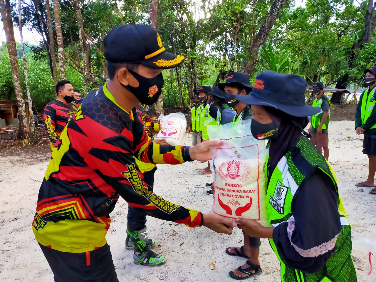 Kapolres Bangka Barat Membagikan Beras ukuran 5 (Lima) Kg sebanyak 30 (tiga puluh) karung, Rompi sebanyak 15 (lima belas) buah,Topi Rimba sebanyak 15 (lima belas) buah kepada masyarakat