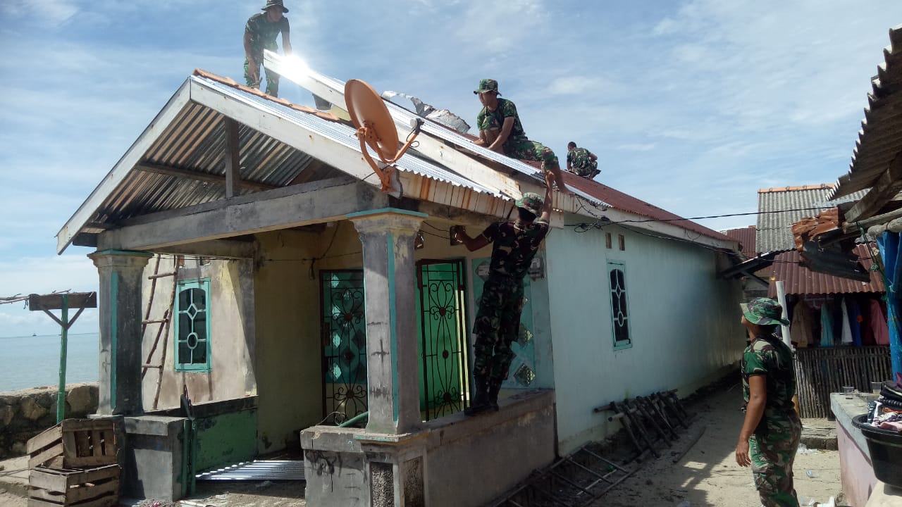 Pjs Perwira Seksi Teritorial(PASITER) Lettu Beni Samosir seizin Dandim 0431/Bangka Barat mengatakan, TNI membantu tenaga merenovasi bangunan warga yang terdampak musibah angin kencang.