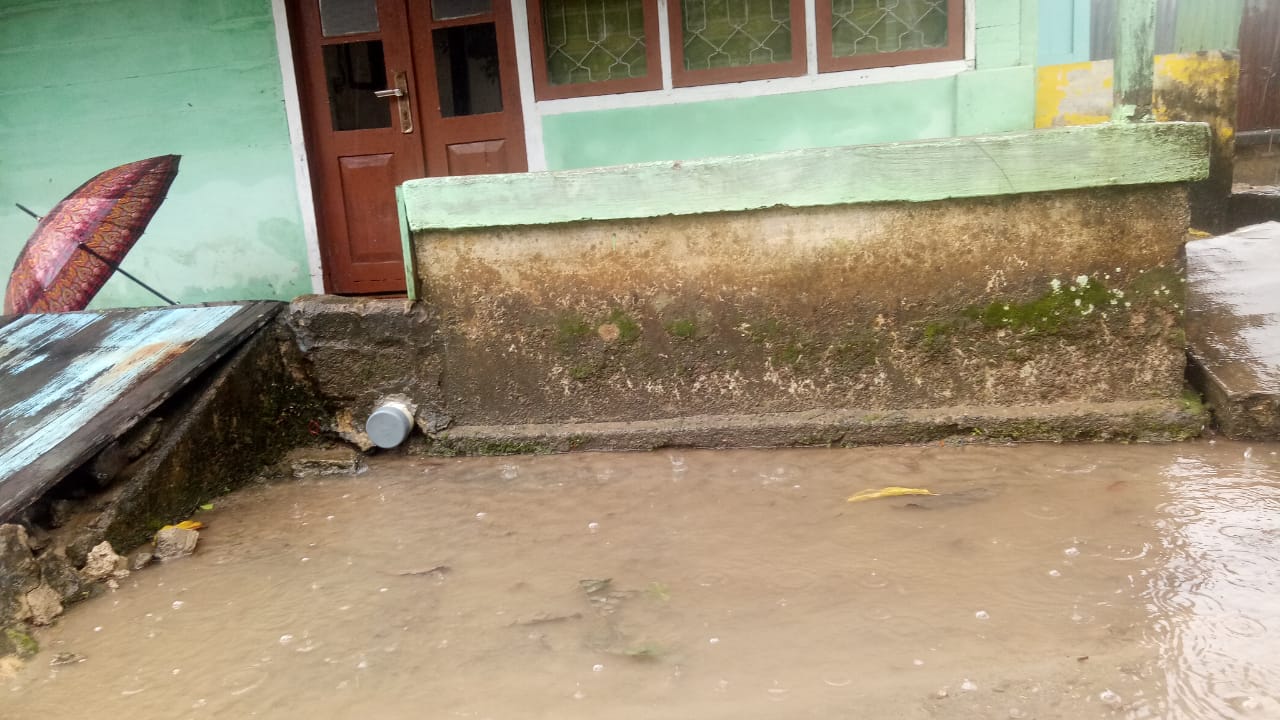 “Air mulai naik dan menggenanggi rumah, airjuga telah masuk dapur rumah, mulai terjadi pukul 5 pagi tadi, lebih kurang 20 cm, saat kondisi laut sedang pasang dan mulai menyusut sekitar jam 8 pagi, sampai sekarang, kondisi ini membuat kami warga menjadi khawatir bila hujan tak kunjung berhenti,”ungkap Nurlaila