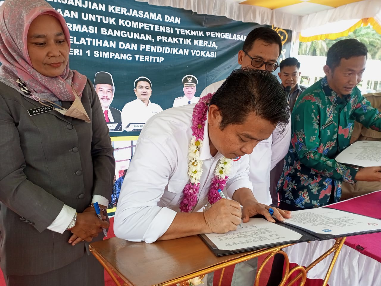 SIMPANG TERITIP – Guna meningkatkan kompetensi siswa guru, SMK Negeri 1 Simpang Teritip melakukan Perjanjian Kerjasama dengan PT DOK dan Perkapalan Sungailiat. Kesepakatan Perjanjian Kerjasama ditandatanggani oleh Direktur PT DOK dan Perkapalan Achmad Dani Virsal dan Kepala SMKN 1 Simpang Teritip Hasdiah S.Pd. Ing. Senin (15/8/2022).