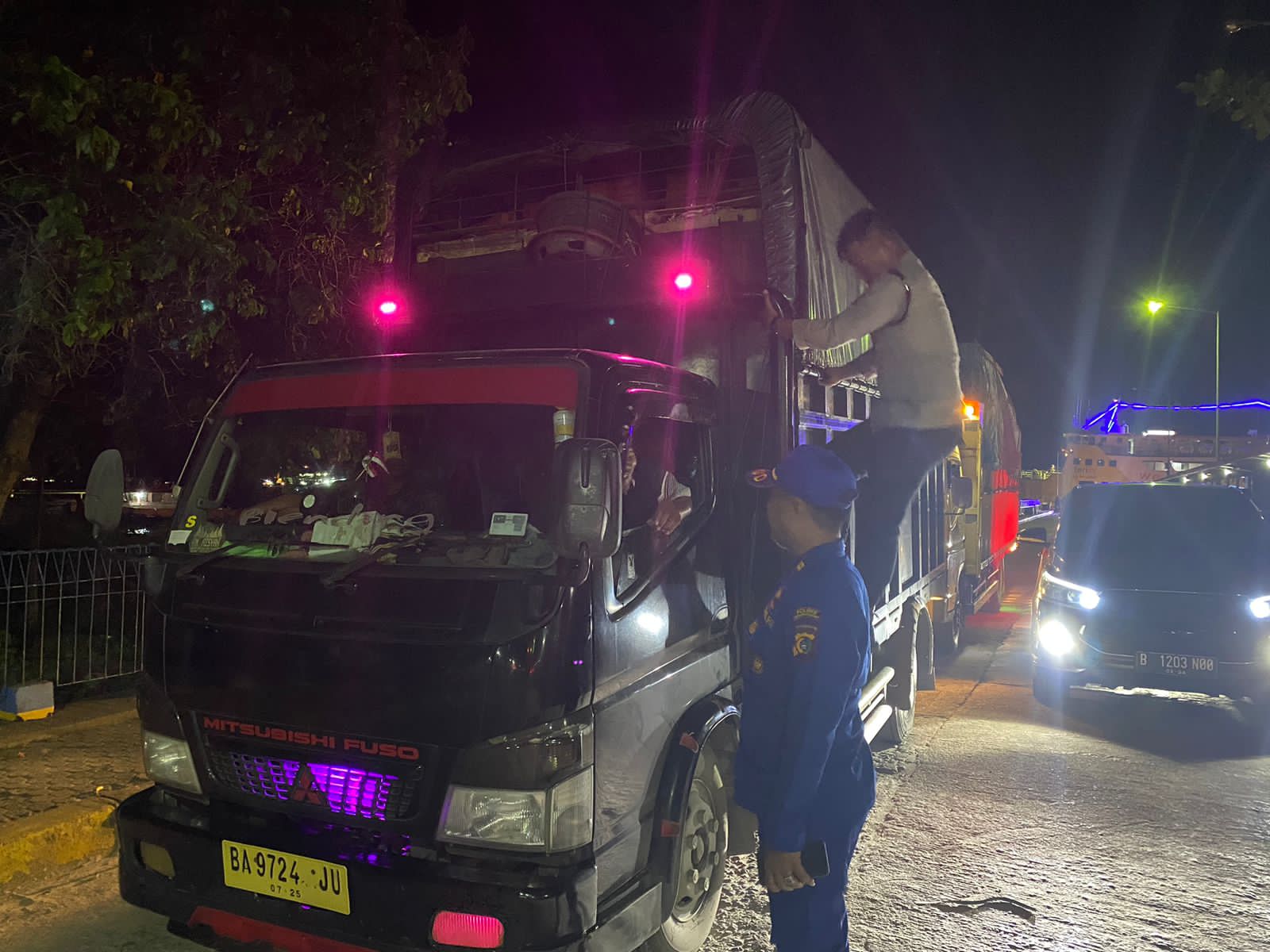 Anggota Pengamanan Polres Bangka Barat melakukan Pemeriksaan kendaraan seperti Mobil dan Motor melalui Kapal Fery.