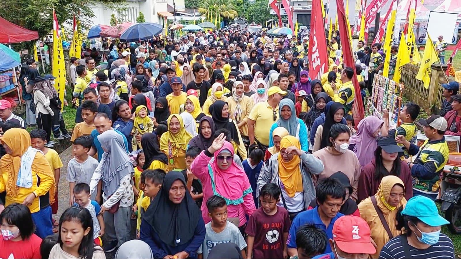 MUNTOK – Masyarakat Kabupaten Bangka Barat antusias dan berbondong-bondong mengikuti Kegiatan Jalan Sehat dan Senam Sehat yang dilaksanakan DPD Partai Golkar Bangka Barat, walaupun sempat diguyur hujan pada pagi hari, tak menggurangi semangat peserta untuk datang mengikuti kegiatan tersebut. Panitia menyediakan hadiah utama 1 unit Sepeda Motor Honda Revo dan ratusan hadiah menarik lainnya untuk peserta.