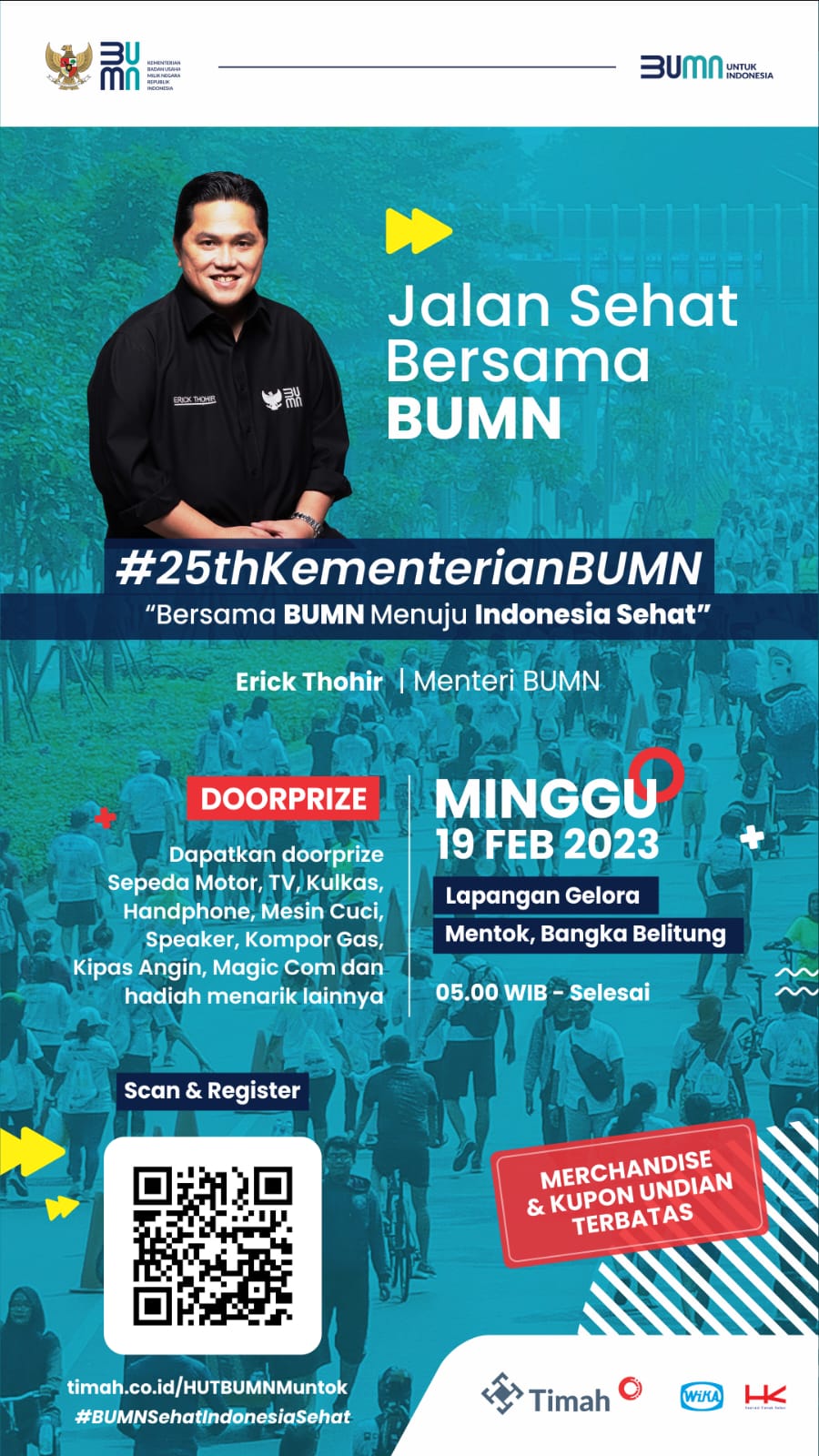 Dalam Rangka Memperingati HUT BUMN yang ke 25 tahun. Yok seperadek, Ikut Jalan Sehat Bersama BUMN pada Hari Minggu, 19 Februari 2023 di Lapangan Gelora Kota Muntok Kabupaten Bangka Barat. Start dimulai Pukul 5.00 pagi WIB s.d Selesai.