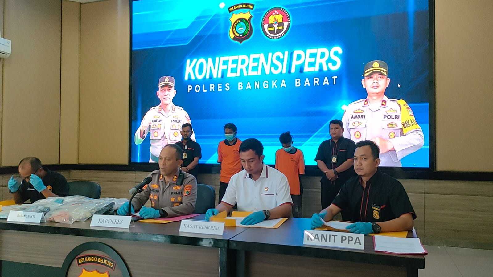 Kapolres Bangka Barat AKBP Catur Prasetiyo SIK di dampingi Kasat Reskrim, Kasihumas, Kanit PPA Sat Reskrim Polres Bangka Barat memimpin langsung kegiatan konferensi pers terkait kasus pencabulan anak.