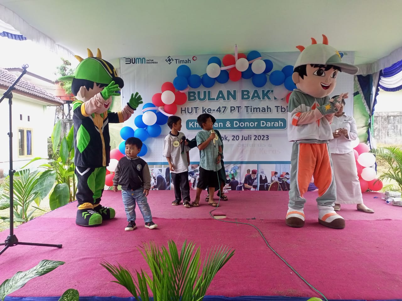 BANGKA BARAT – Kehadiran badut dengan karakter BoBoBoi menambah semarak kegiatan khitanan massal Bulan Bakti PT Timah Tbk yang digelar di Unit Metalurgi Muntok, Bangka Barat, Kamis (20/7/2023).