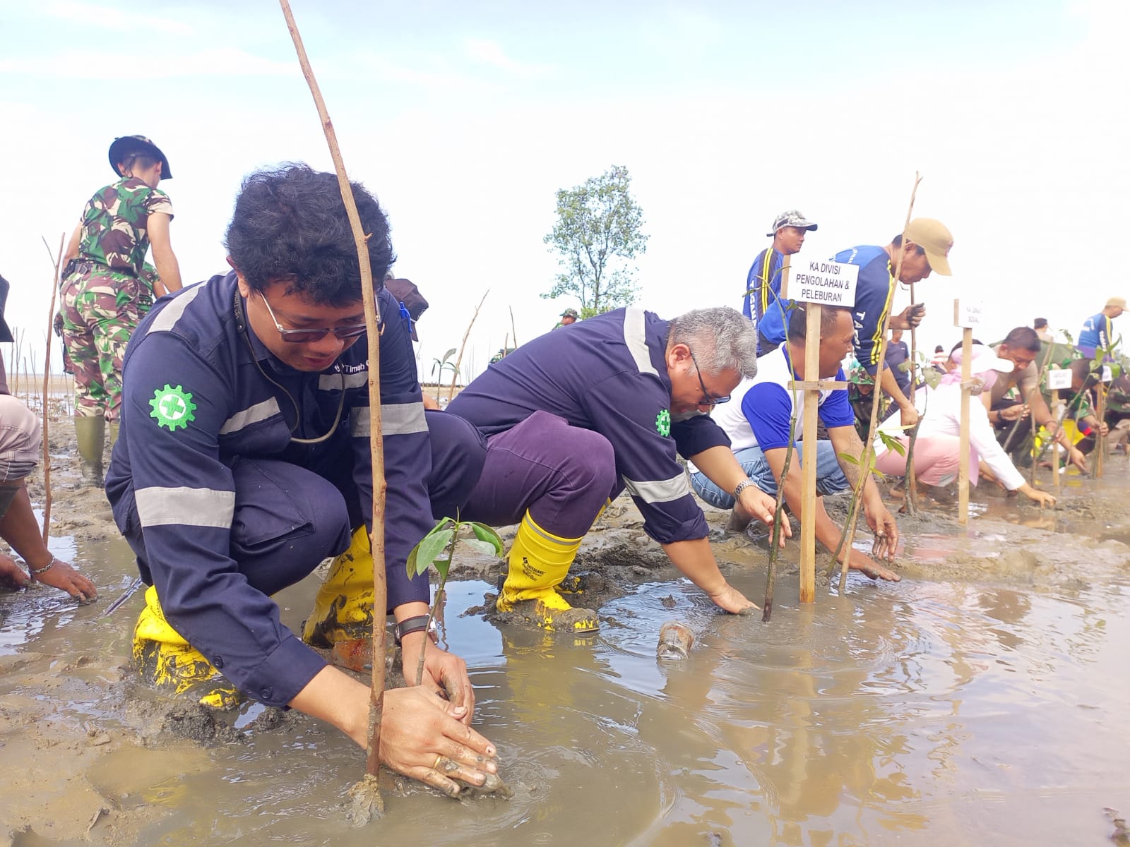 PT Timah memberikan dukungan sebanyak 500 bibit mangrove dan patok air, sejumlah karyawan PT Timah ikut serta melaksanakan penanaman mangrove bersama dengan anggota TNI, POLRI, Pemerintah, Kecamatan dan Masyarakat.