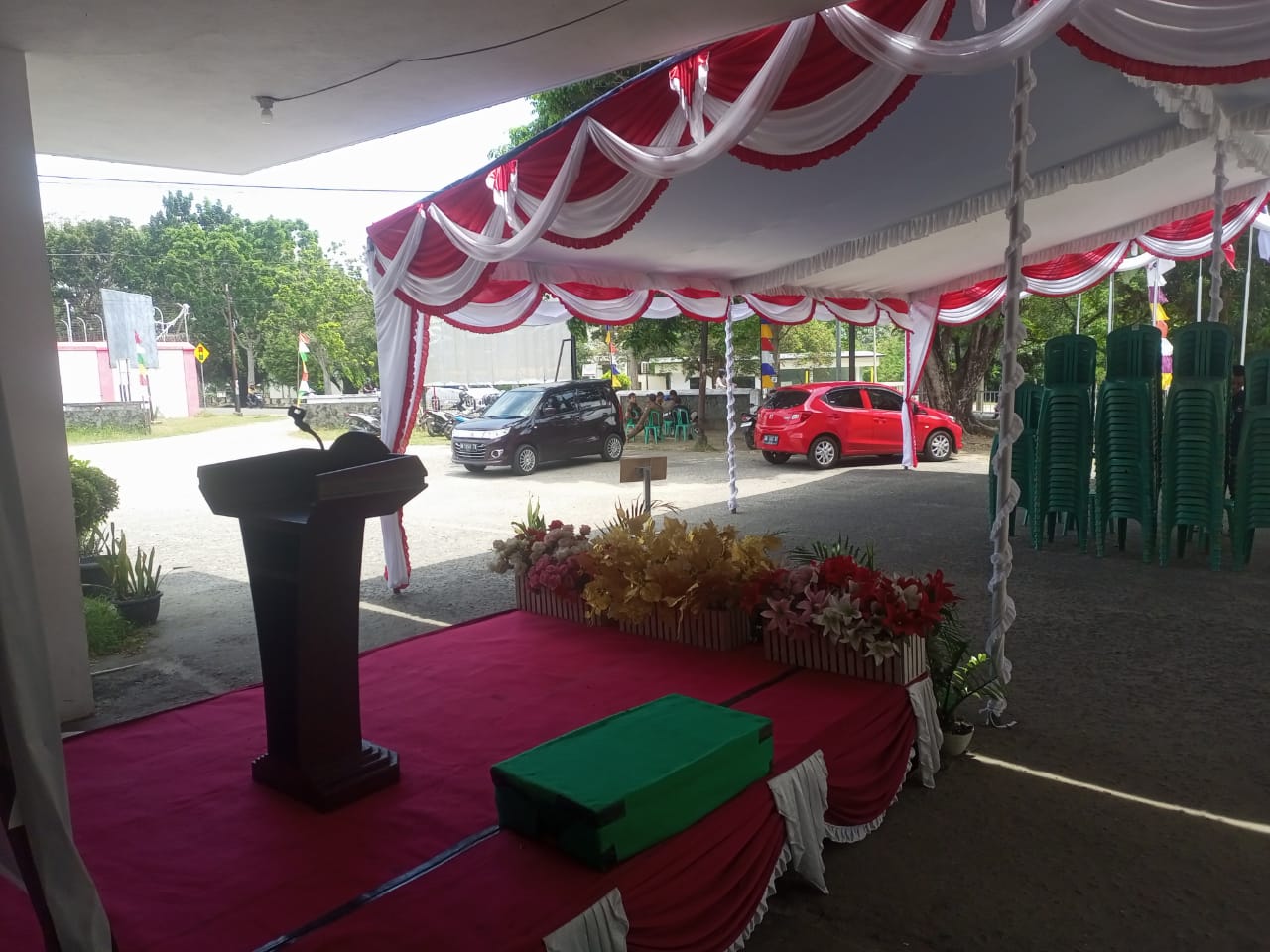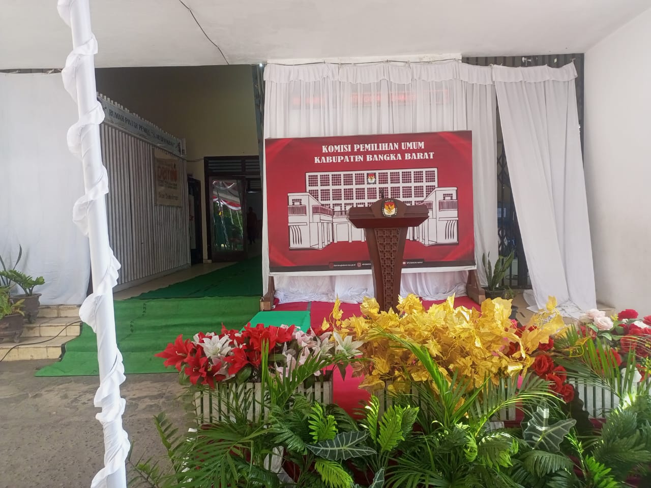 PILARRADIO.COM, Mentok – Suasana hari pertama penerimaan persyaratan Calon Bupati dan Wakil Bupati di Kantor Komisi Pemilihan Umum (KPU) Bangka Barat tampak berbeda dari biasanya. Terlihat di halaman terpasang tenda dan podium, karpet hijau terbentang menuju ruangan Kantor KPU Kabupaten Bangka Barat.