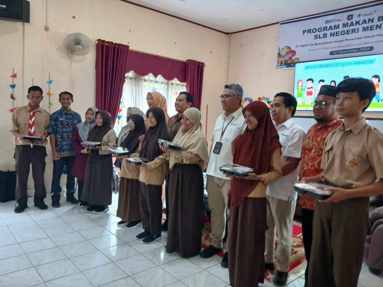 BANGKA BARAT – Setelah safari dukungan makan siang bergizi di berbagai wilayah bagi anak anak sekolah, hari ini PT Timah bersama siswa siswi Sekolah Luar Biasa (SLB) Mentok antuasias mengikuti uji coba program. Makan Siang Bergizi yang didukung PT Timah berkolaborasi dengan Pemerintah Kabupaten (Pemkab) Bangka Barat (Babar).