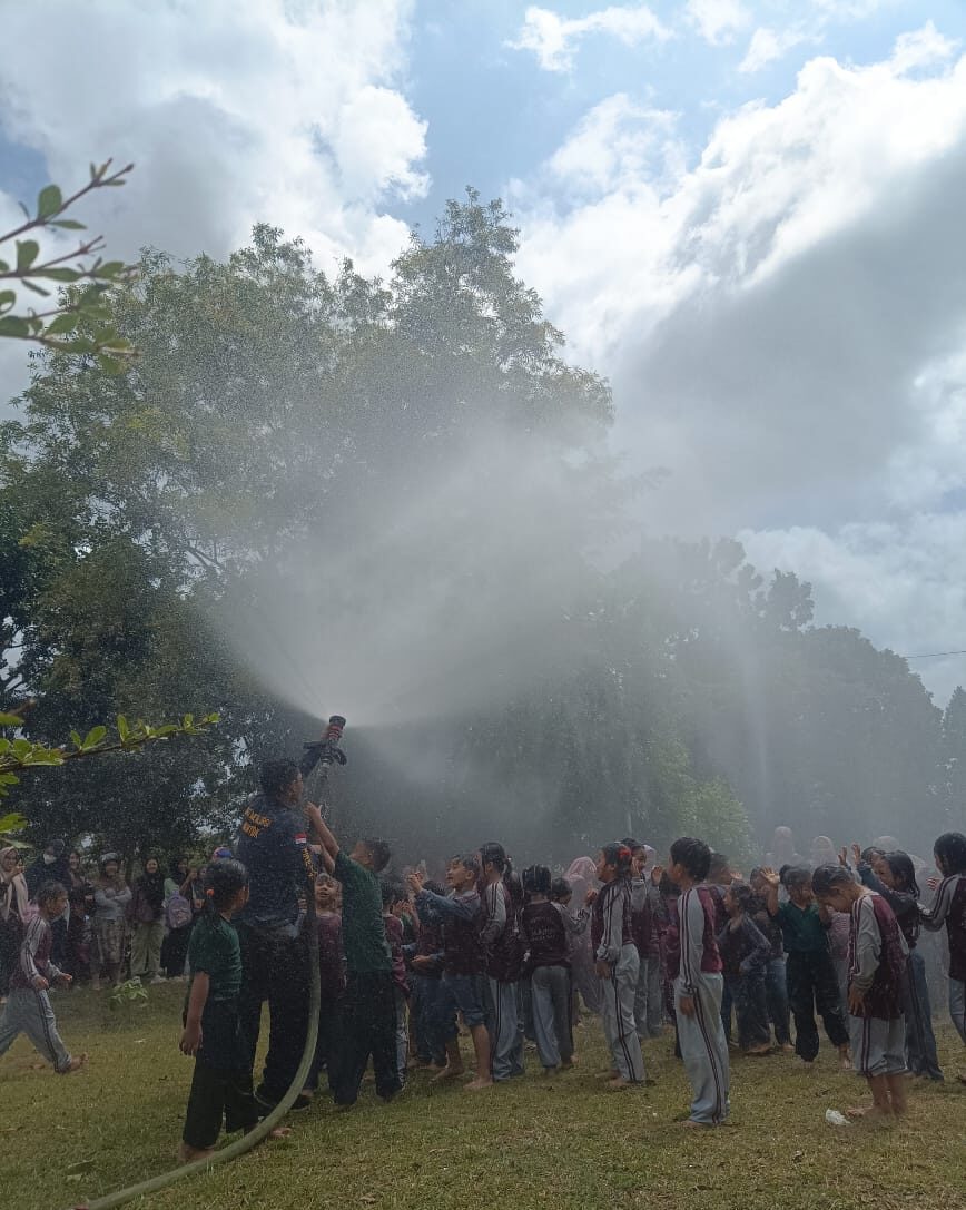Para pelajar tampak antusias saat gembira saat mendapatkan penjelasan dari Tim Damkar PT Timah Tbk.