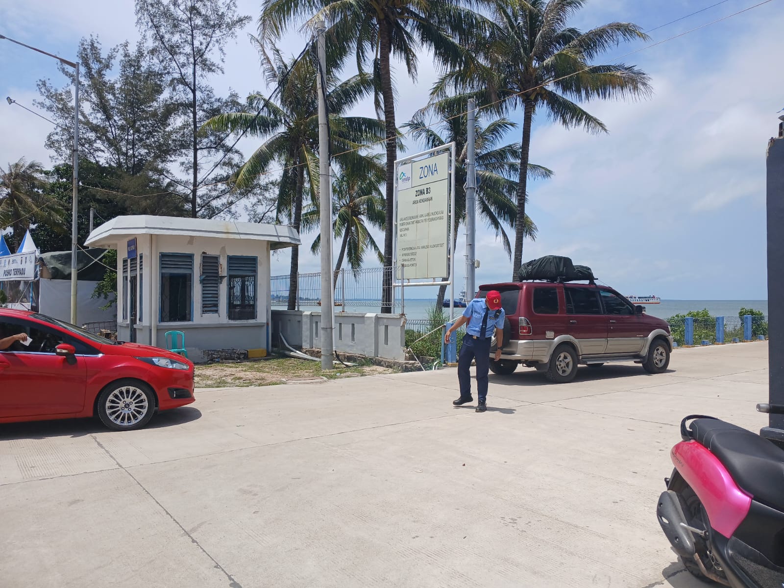 Arus kendaraan pribadi dari sepeda motor hingga kendaraan roda empat ber plat luar terlihat keluar masuk di pelabuhan.
